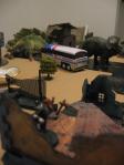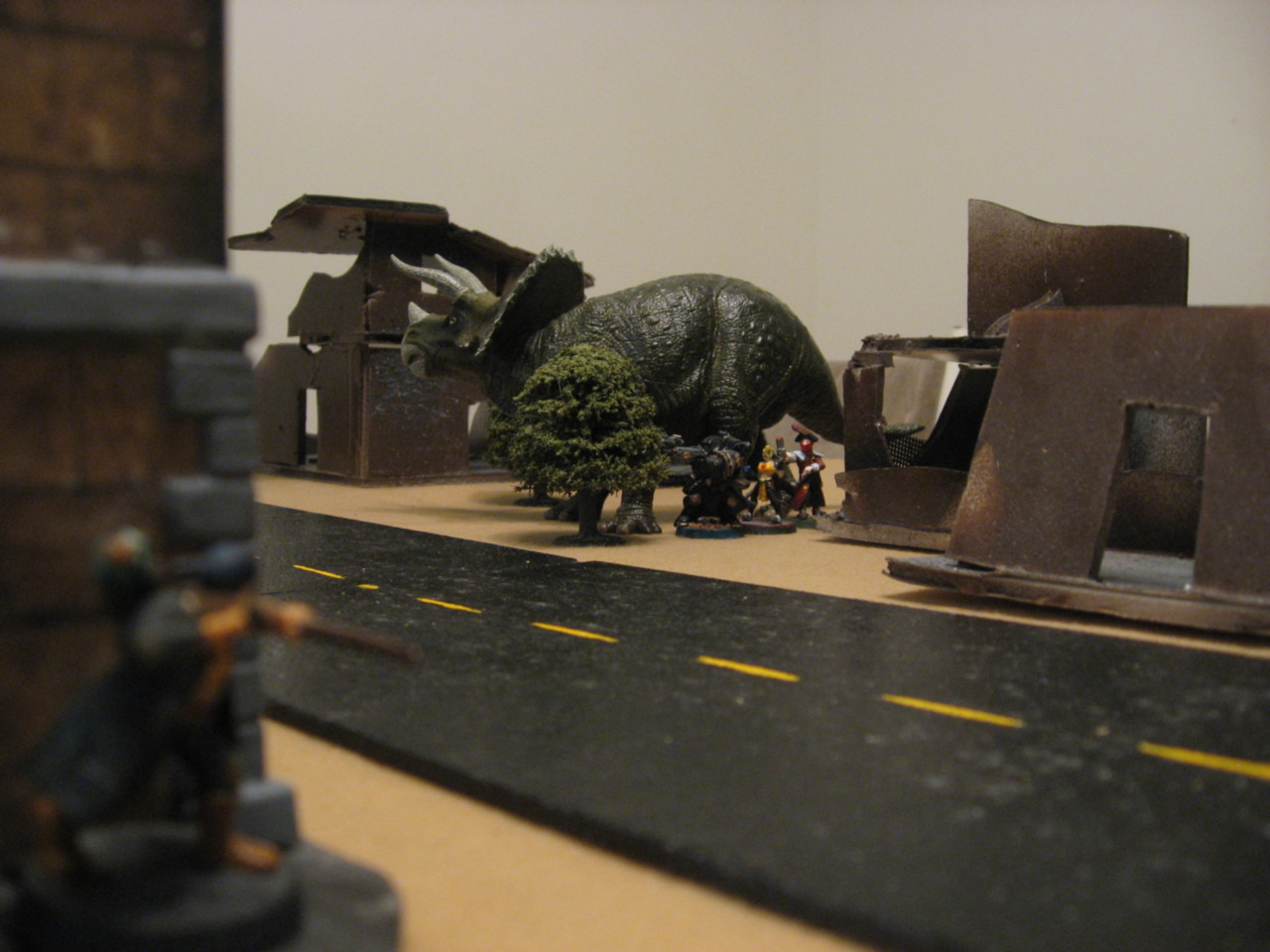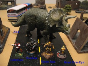 Coleman: Now that Shadow was free from Thunderfoot, I could shoot without penalty at the dinosaur, and also move if I wanted. I opted to stand and shoot, and hit for a big 8 damage. That higher powered Six-Shooter is nice. Anyways Zira moved away from the bus, trusting in the humans to take care of Thunderfoot. She headed across the road towards Hasheen who was moving up the flank by the building. Too bad I rolled a 1 on my Charge and failed to reach him.