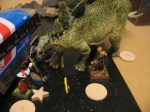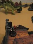 Coleman: I saw a perfect opportunity to clear Thunderfoot out of there so that I could move the rest of my team without suffering Snap Attacks. This opportunity was realized by activating Newt’s “Knockback Shot I”, then shooting short range at Thunderfoot. I needed an 11+ to hit, but I still hit once and did 3 damage. More importantly Thunderfoot was moved backwards 2″ (thanks Knockback), and Slowed (due to the Stun Gun). Plus Stone Axe had charged into the dinosaur’s flank, so he was still in melee with her.