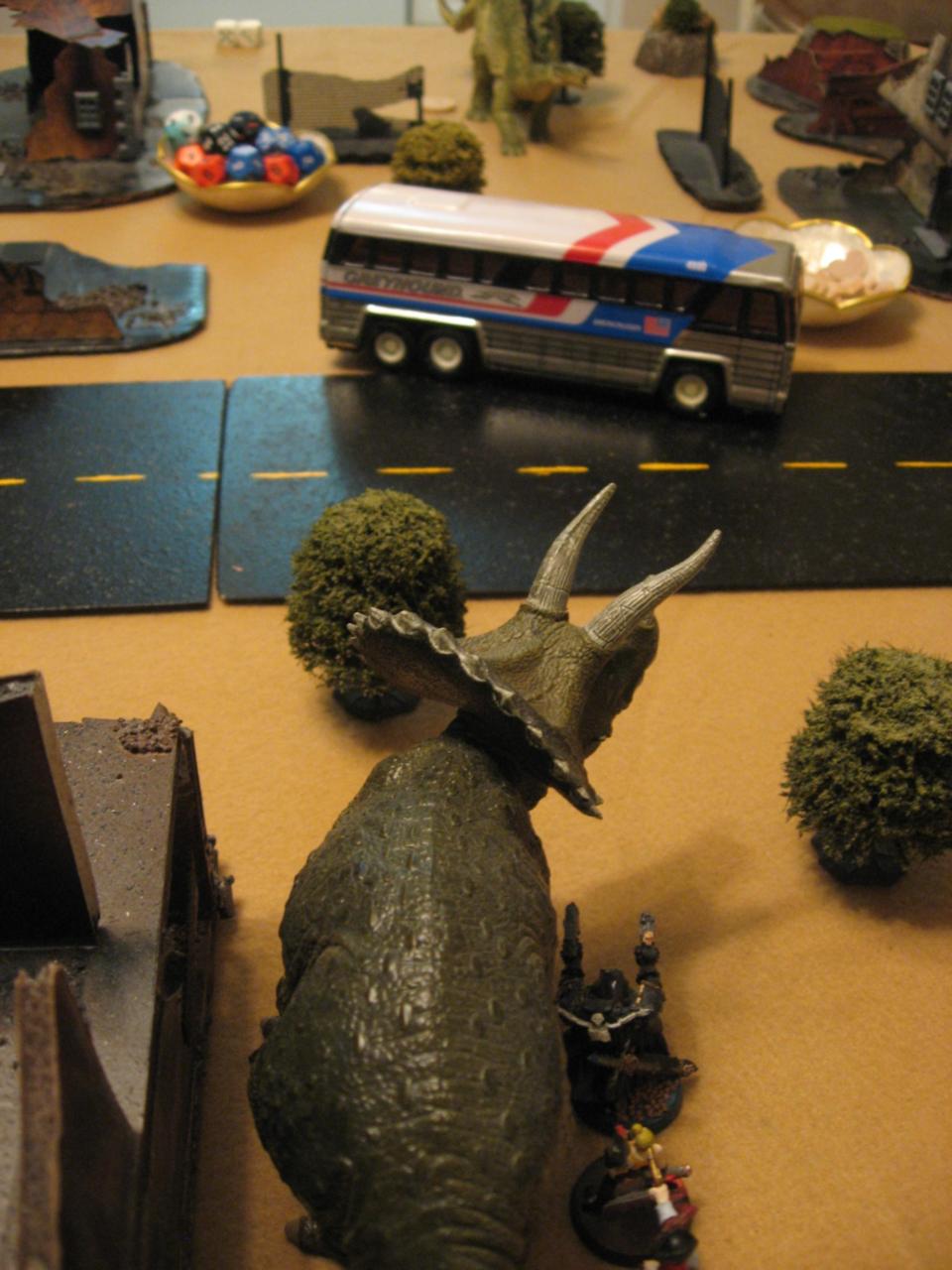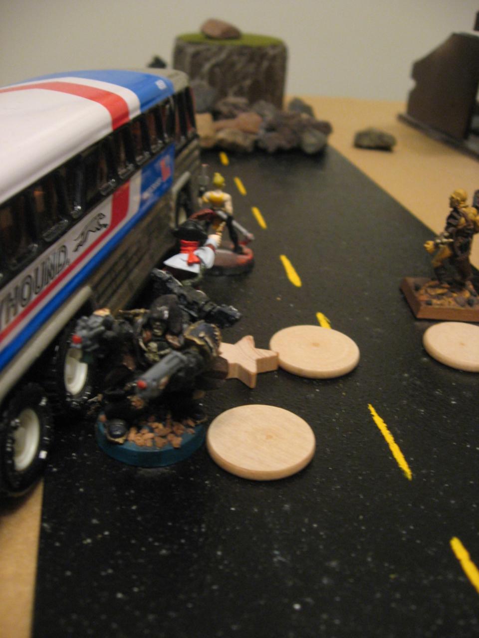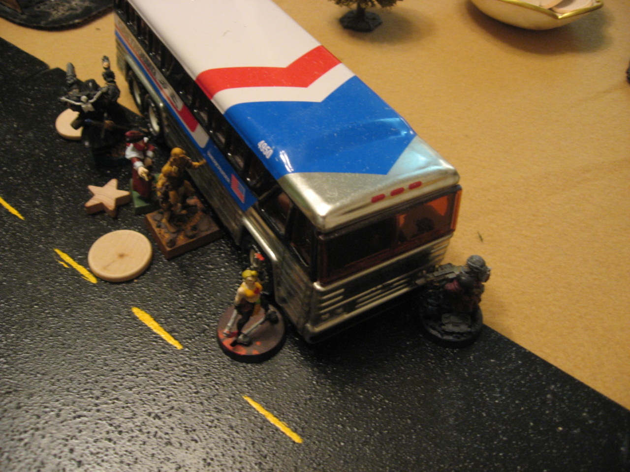 – Duskhelm has no targets so he shoots the bus for 3+2+1 damage, bus has 6 HP left
