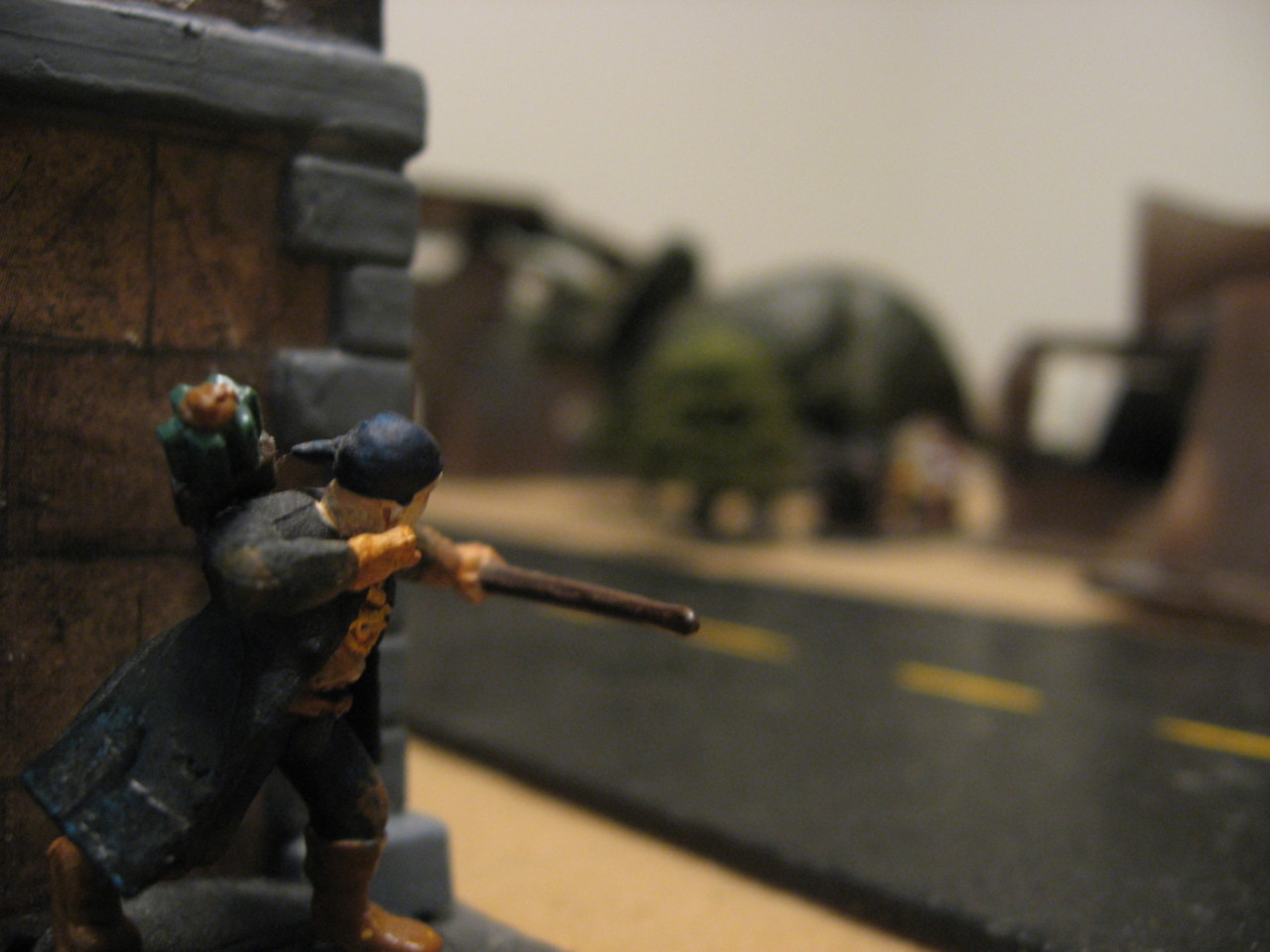 Duskhelm: Like I said I wanted to keep organized teams. This meant Duskhelm and Mitis’Heq stuck together on the left flank. I planned to get them into a good position in the house ahead where they could overlook the main road. Thunderfoot was next and took the middle, his purpose being to run to the bus and keep the enemy locked down. Snap Attacks help! Redbeard was aiming to snipe. Although his inexpensive Musket was Auto reload (so he could only fire every other turn) it still had a 28″ long range (with his Eagle Eye trait) and was Scoped (ignore Cover), so it could definitely sting. Finally Burt and Hasheen stuck together on the right flank, likely moving to the next building and potentially getting into a solid crossfire with Duskhelm and Mitis’Heq. At least that’s the plan…