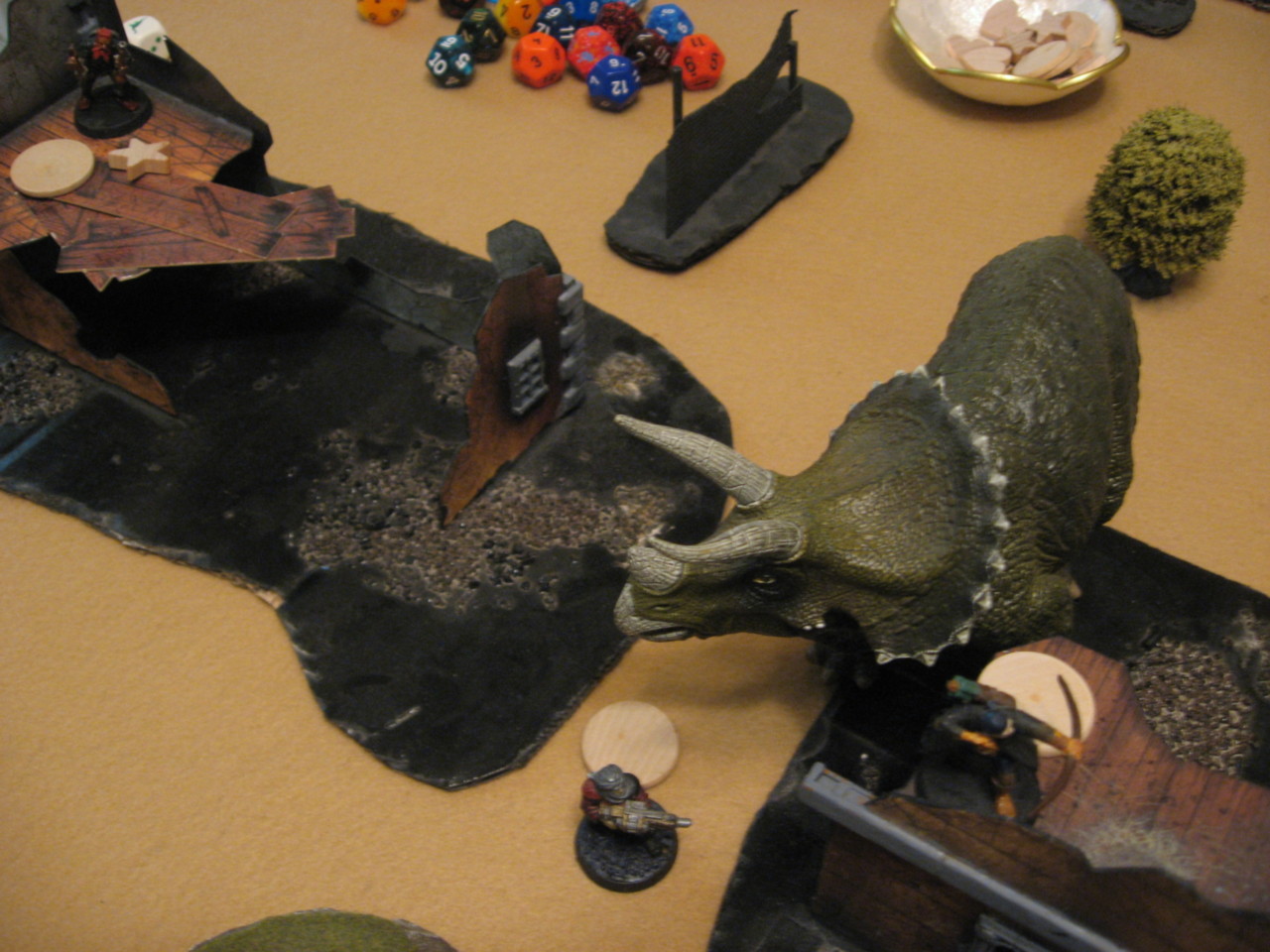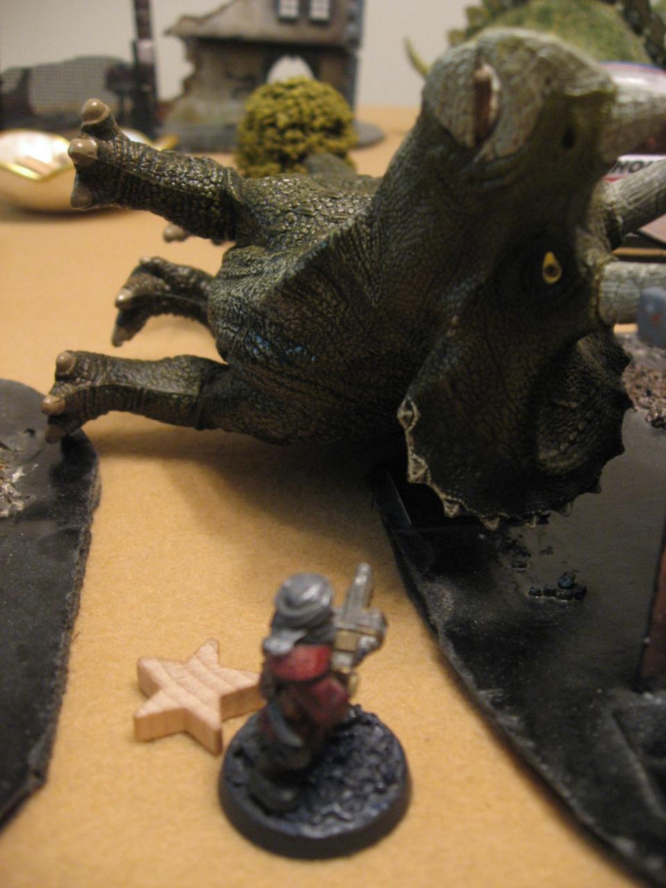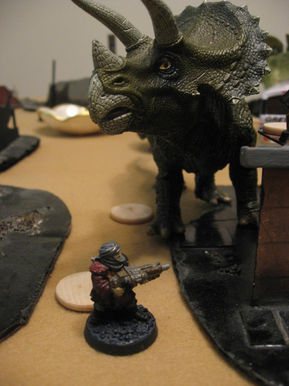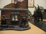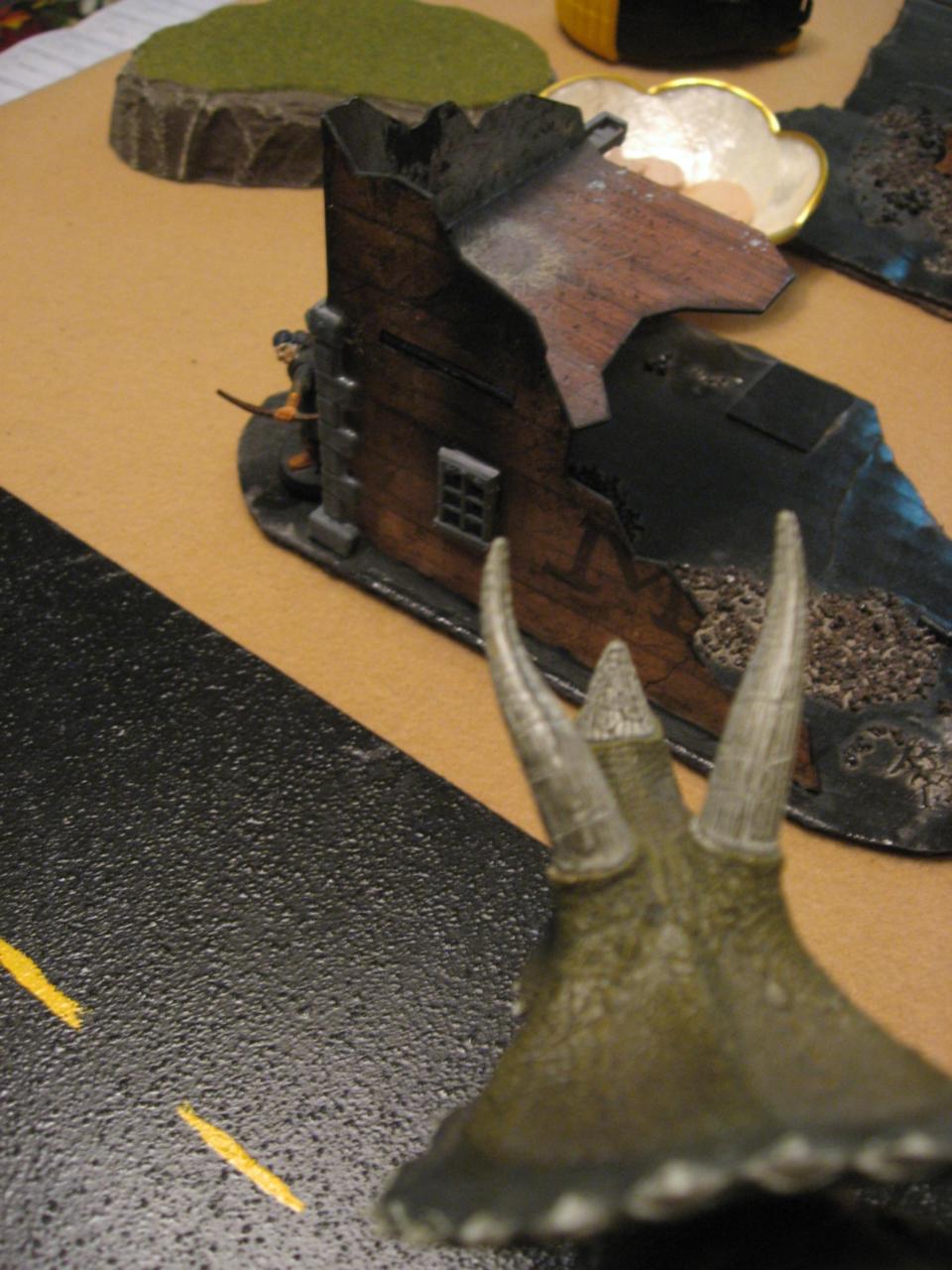 Duskhelm: Zira’s failed Charge basically gave me one free turn to escape her grasp. I moved Hasheen to the second floor of the building, mainly to get Elevation bonuses but also to put himself further from the dinosaur. I used the “Both Barrels” special feature of the Double Barrel Shotgun (+2 Attacks but need Reload), but missed all 4 attacks (at 10+ to hit). Finally Burt fired at Zira from his position around the building corner, but also missed with all his shots. Grr. He moved back to the edge of the house, again to try to distance myself and postphone the melee.