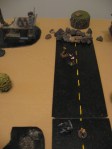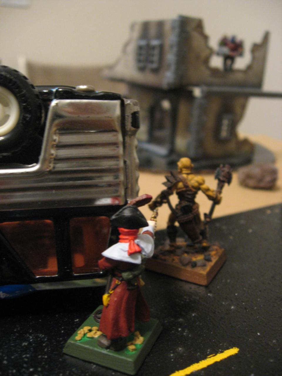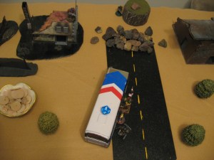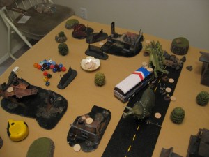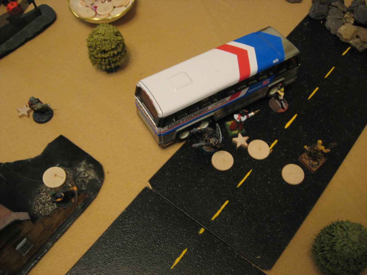 My kitchen table was the battlefield again, 4 feet long and 3 feet wide. Instead of my usual mishmash of hills and trees I went for a town look. The buildings are pulled from Mordheim and a few foamboard creations from my youth. The roads are more recent and I actually made them for Car Wars. They fit in with the theme well. The bus was an some old Greyhound toy, but the scale was mostly right. The bus could be attacked and explode and was treated as: