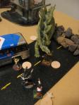 Duskhelm: Most of Coleman’s team was mounted (and therefore treated as a single Activation) and I won a few Activation rolls so I ended up moving all of my team at once. Duskhelm, Mitis’Heq, Burt, and Hasheen all advanced forward. The former two used a Standard Move, the latter two Ran. Thunderfoot crept up the middle, ending up behind a tree that scarely covered his bulk. Finally Redbeard stood where he was, as I measured the distance and figured Coleman’s gang would get into range soon enough.