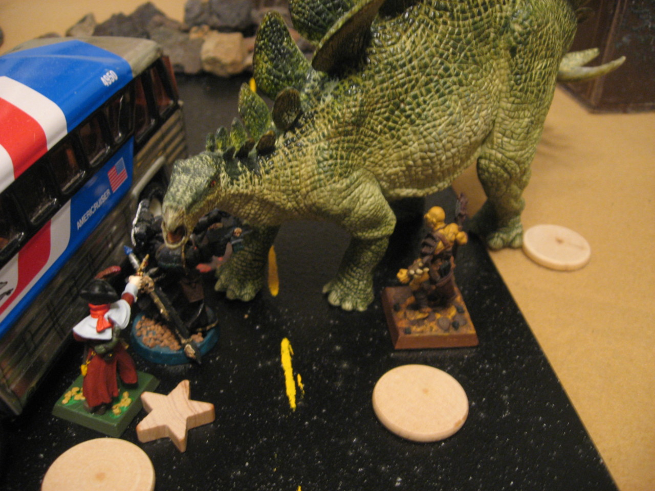Coleman: I moved Shadow around a bit, still behind the bus, and fired at short range against Thunderfoot, hitting for 5 damage. The dinosaur was now down to 8 HP!