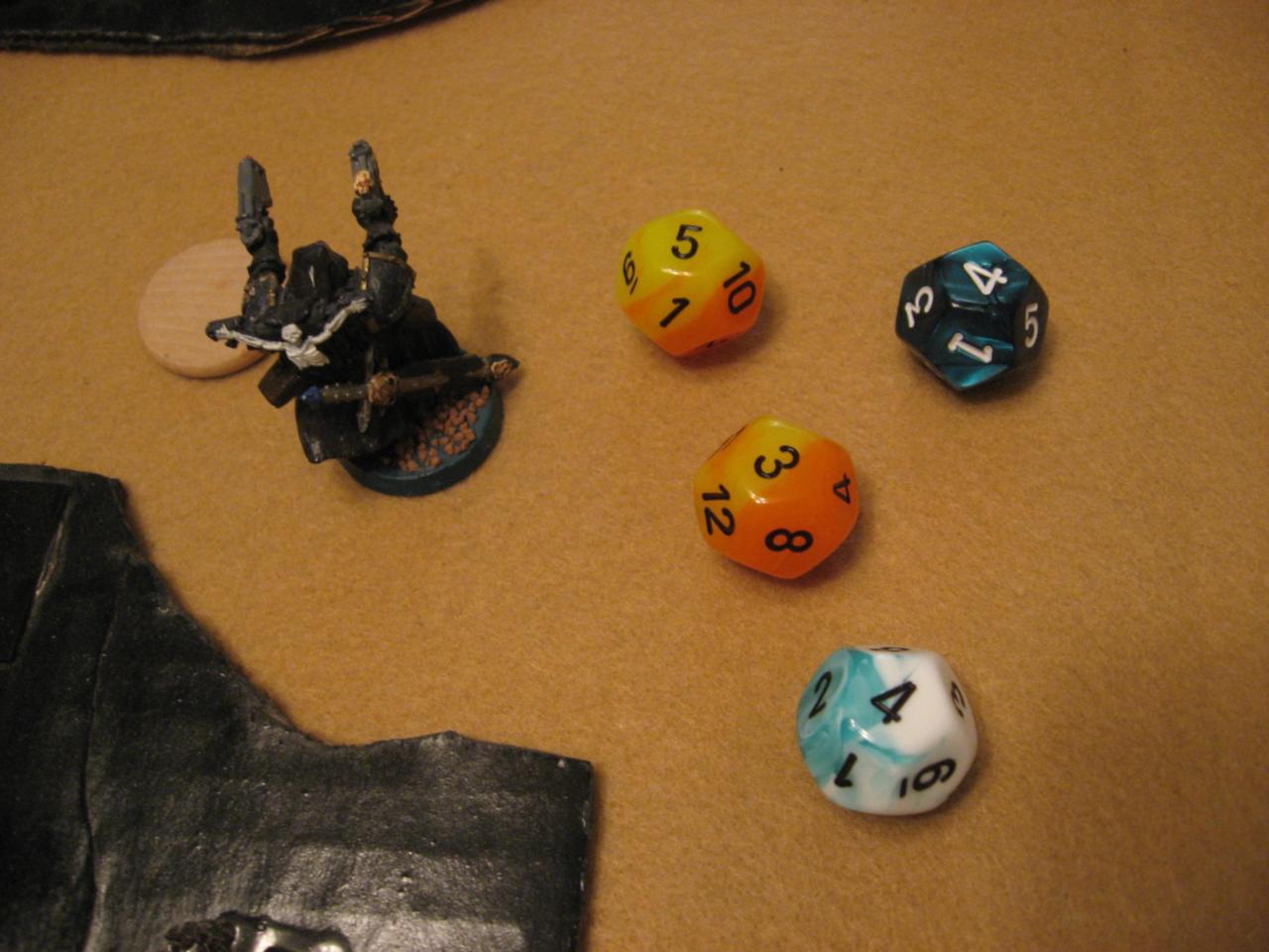 – Thunderfoot moves up, tries to Charge Shadow at 6″, rolls 6! Charges in, hits for 4 damage