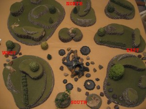 Both sides could deploy up to 4″ in from each short table edge. Glenbrook had to deploy first and chose the east side, followed by the t-rex on the west side.