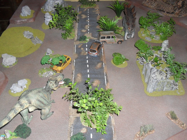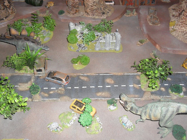 I’ve got a real treat today from Ross (who you might remember as the creator of two great looking Posses). He has pulled together a terrific looking Dinosaur Cowboys themed table replete with rusted cars, shattered roads, and overgrown ruins. Pictures speak louder than words, so enjoy: