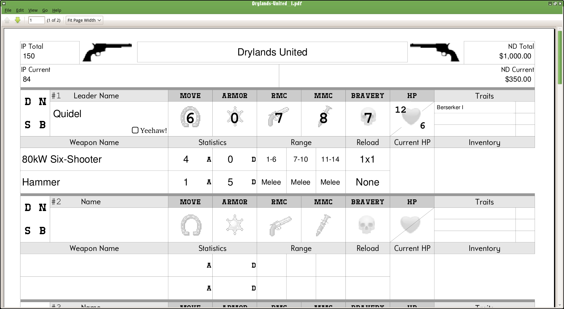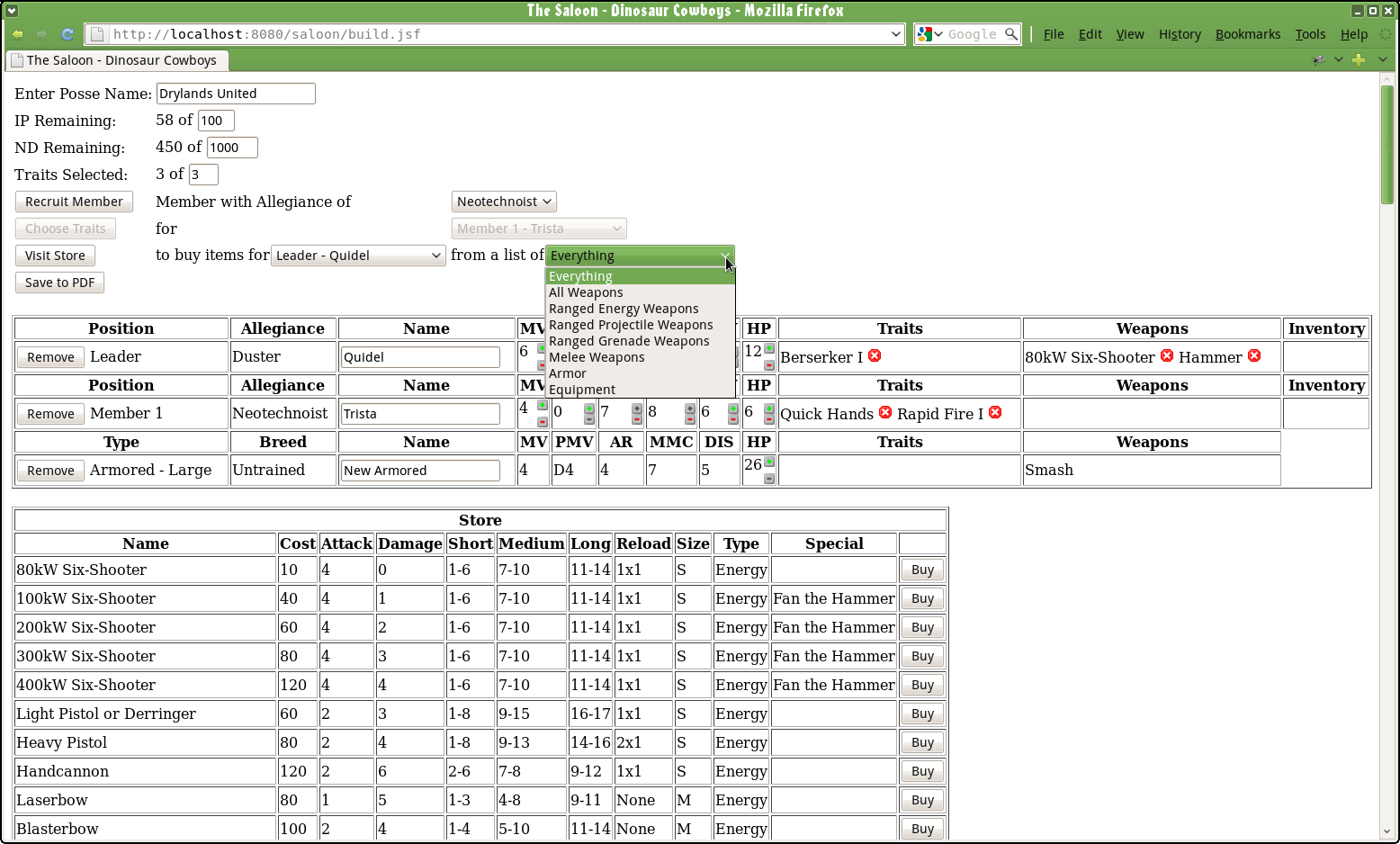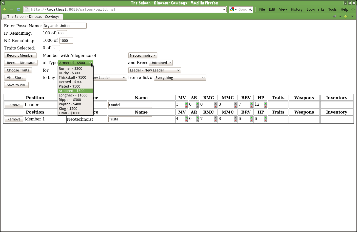 Remember how I started on that fillable PDF posse roster a while back? I did some initial coding a while back, but now (between bouts of Nanowrimo) I sat down and worked on it some more. Right now it’s in a rudimentary unstyled state with a couple of missing pieces of functionality, but in general it works pretty well at creating a posse, modifying their stats, applying traits, and buying items. I’ll need to update the PDF to use v1.0 (especially the new dinosaur statline) and finish with the exporting of that, but yeah, getting close. Eventually I’ll host the application and link to it from here. It’s written with Java and JSF. No timeline on when that will be since I’m kind of just working on this when I have an hour or two.