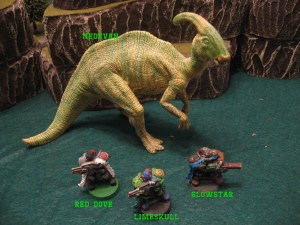 The two posses involved were Hope’s Wardens and Tribe of the Blood Pact. I originally created them for the v0.91 rules, so you can see some of the thought behind the posses in an earlier post. Both posses ended up with 3 members and 1 dinosaur even after the update to v1.1, and mostly just had better equipment with some of the extra money from recruiting the first Member for free.