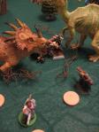 Blood: The Crimson Terror lived up to his name by stomping and goring Glowstar, who was unluckily stuck between two towering dinosaurs. I hit for 5 damage which killed the human. Also I got to remove my last Panic token…not that it mattered since it looked like a straight up brawl to the death between the dinosaurs.