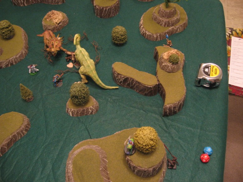 Blood: The Crimson Terror still has two Panic tokens, so I had to roll for his PMV again. I lucked out and got a 4, so I was able to move and then Charge 2″ into melee with Glowstar. I rolled well and hit for 5 damage, but Glowstar managed to pass his Bravery Test. After recovering his wits the dinosaur still had 1 Panic token left.4c. Blood wins Activation