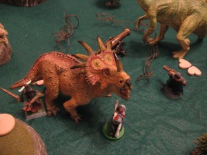 In this game the Cannon could actually be controlled and fired if a human was close to it. Basically whoever had the most humans (dinosaurs don’t count) within 4″ of the Cannon could spend the Action Phase of any of those humans (max of 1 per Turn) to fire the Cannon. It has similar stats to a Field Gun, except the damage is less crazy since these were fresh Posses.