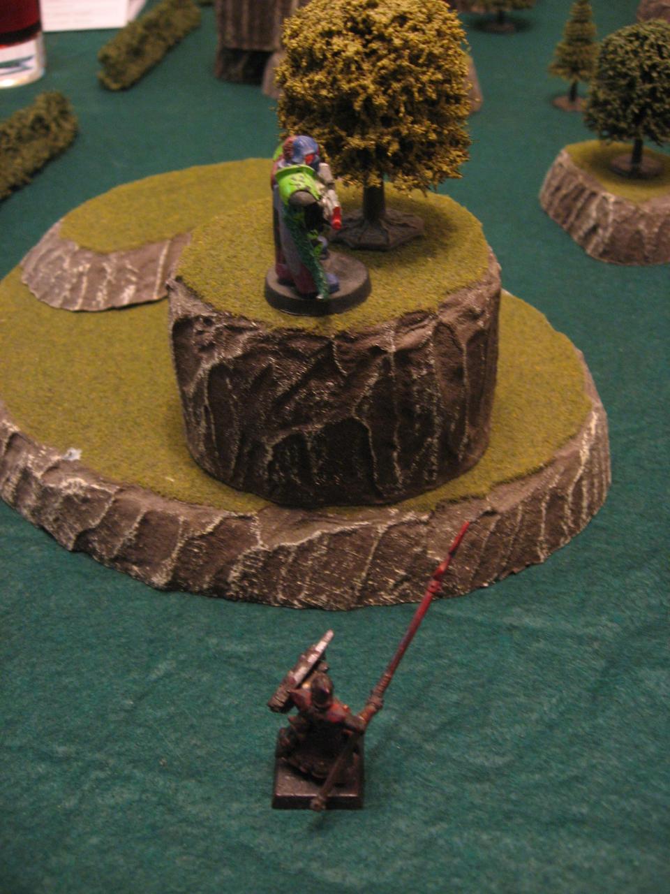 – Sendar moves behind hill and Charges 2″ into Ducky, hits 4 out of 4 times on 7+ for 8 damage, kills Ducky!
