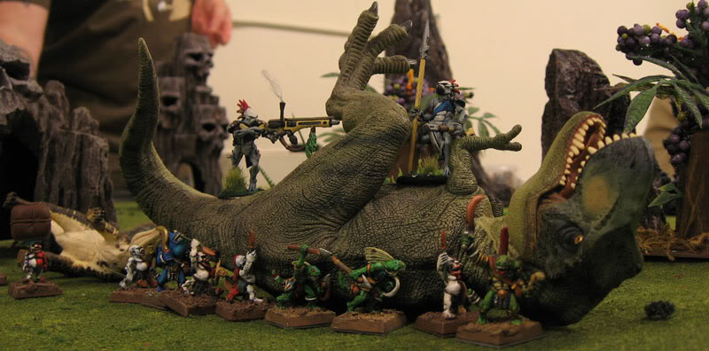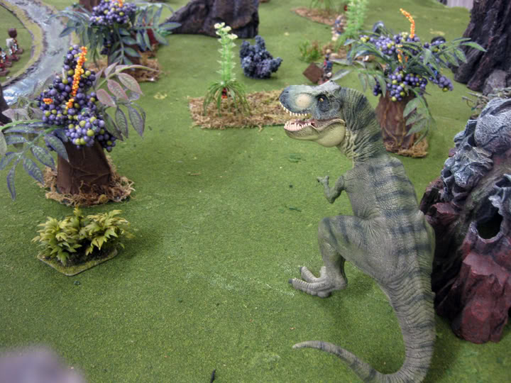 Of course once a person starts searching for “Saurian Safari” you find numerous other awesome photos and battle reports, such as this one about Pirates vs Dinosaurs on an awesome island layout (that really makes me think of Settlers of Cattan).