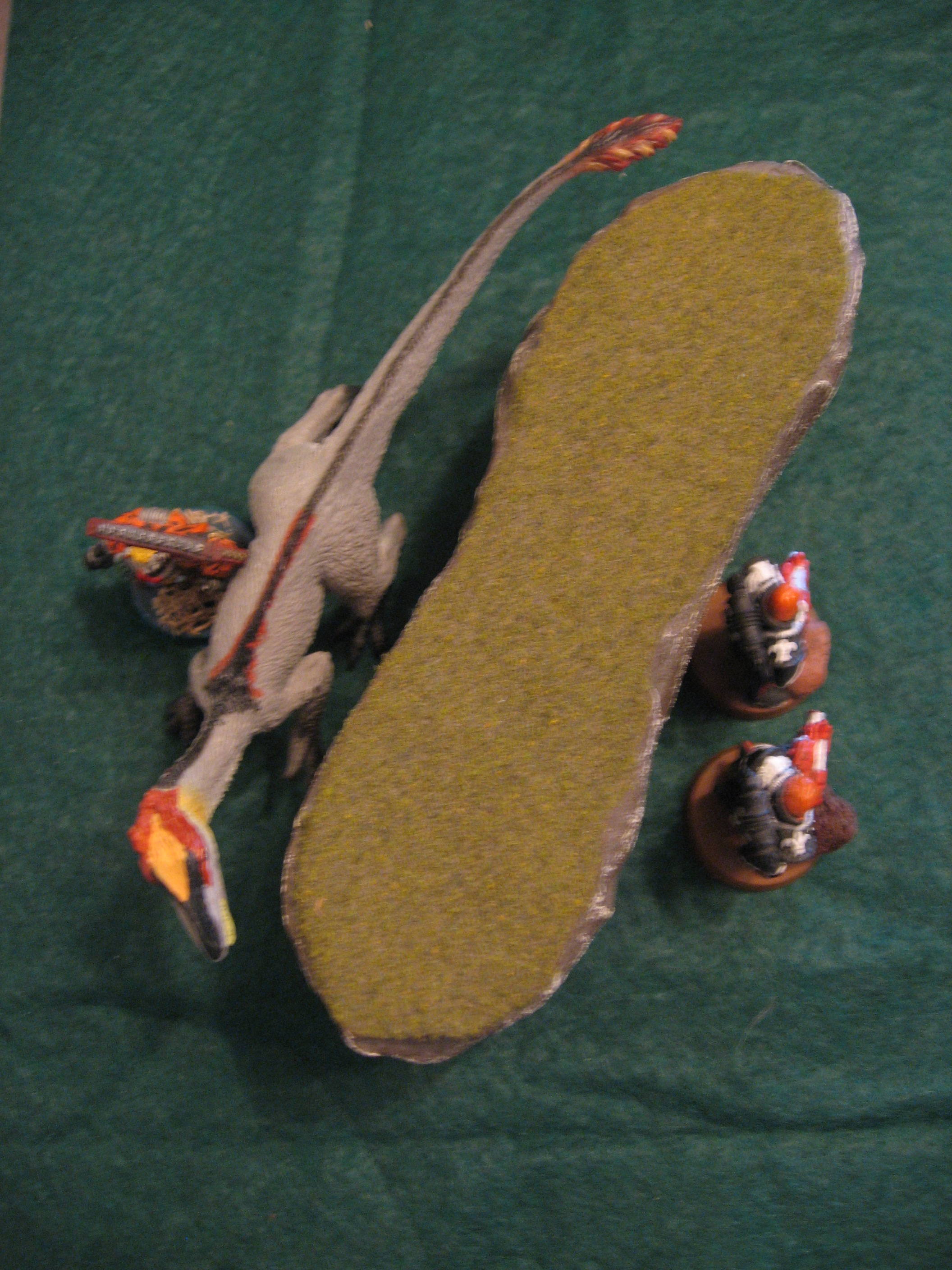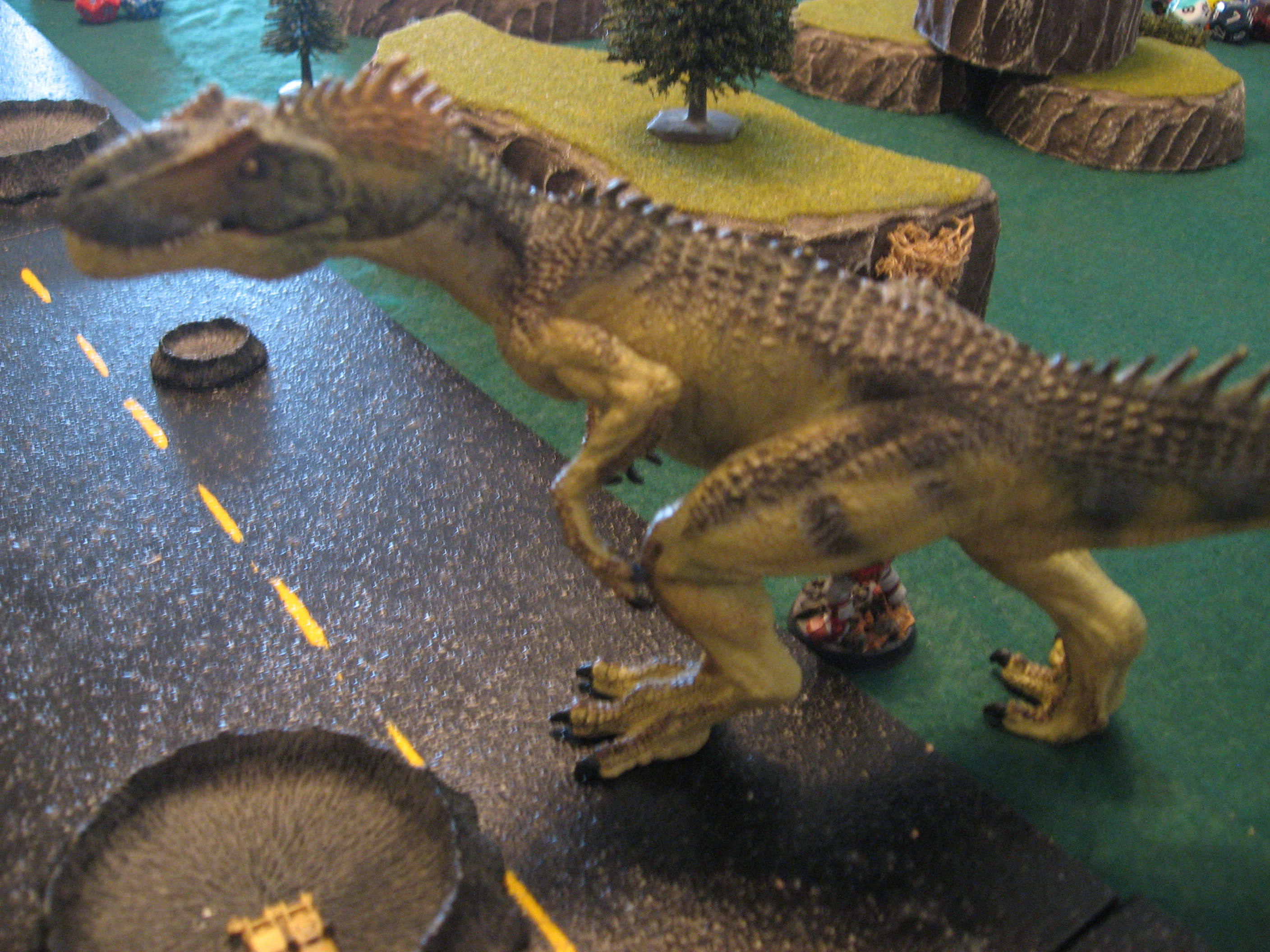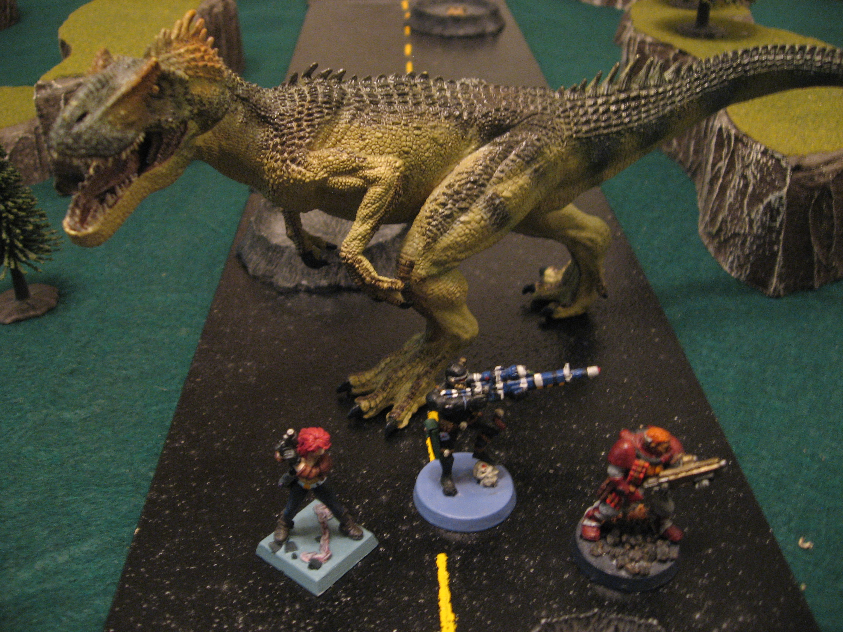 My goal for the posse was to have a team of hard hitting, vicious combatants who could fight on their own. No weak links here. The Neotechnoist Leader named Ice (reminiscing of the TV show Gladiators) exemplified this with good AR and HP, deadly RMC, and a terrific 400kW Lever-Action rifle for sniping. I gave him the Knee Shot trait since enemies will undoubtedly move, and the +3 Damage from it would mean at least 8 damage if the rifle hit, and upwards of 10 before factoring in criticals. That’s good news for single shotting some basic enemies. Next up was Kallas who used a Double Barrel Shotgun and the Speed Reload trait to hopefully fire Both Barrels in a row with deadly effect. He’d be a bit shorter range, but again AR 1 and HP 12 should see him across the street. Jordana was next (you can thank the TV show Chuck for that one, since it had Jordana Brewster on it for a bit). I gave her a heavy 300kW Six-Shooter, which does a respectable 4A-3D and would be deadly if she used Fan the Hammer. Similar stats for her as Kallas, since I had IP to spare with only 3 humans. My dinosaur choice was made simply because I hadn’t tried the Allosaurus out in combat yet, and it’s such a dynamic toy that I wanted to give it a shot. So I made a Plains King Dinosaur named Klahr, who continued the “deadly weapon” idea with his 1A-7D Bite.