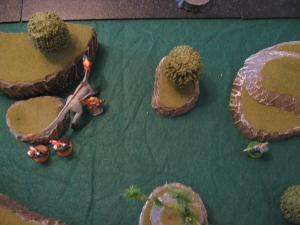 Jordana is too slow to move normally down the tall hill (2” height = 4” MV, she only has 3) so she is Stunned instead due to her Fleeing. Stays where she is.