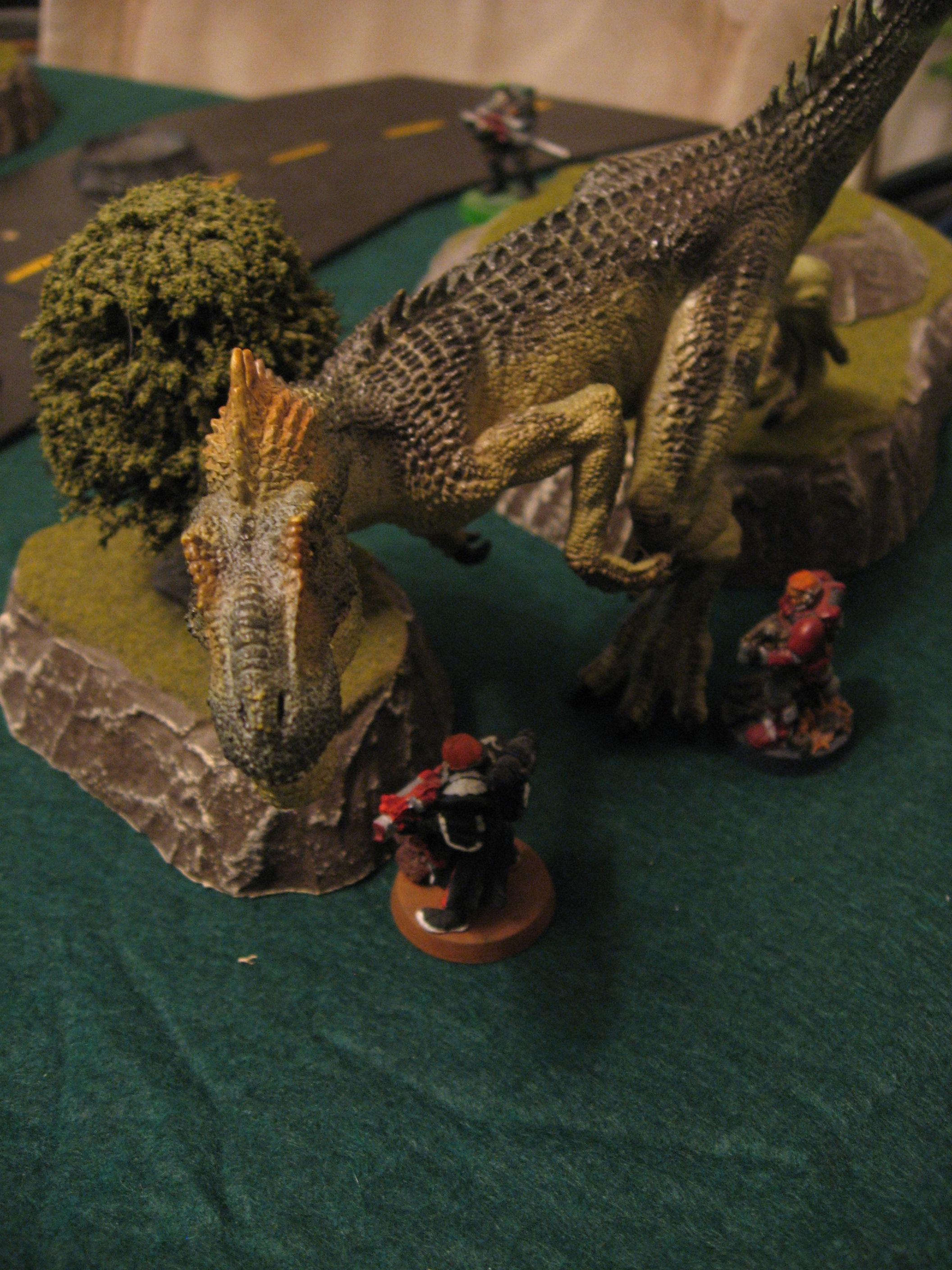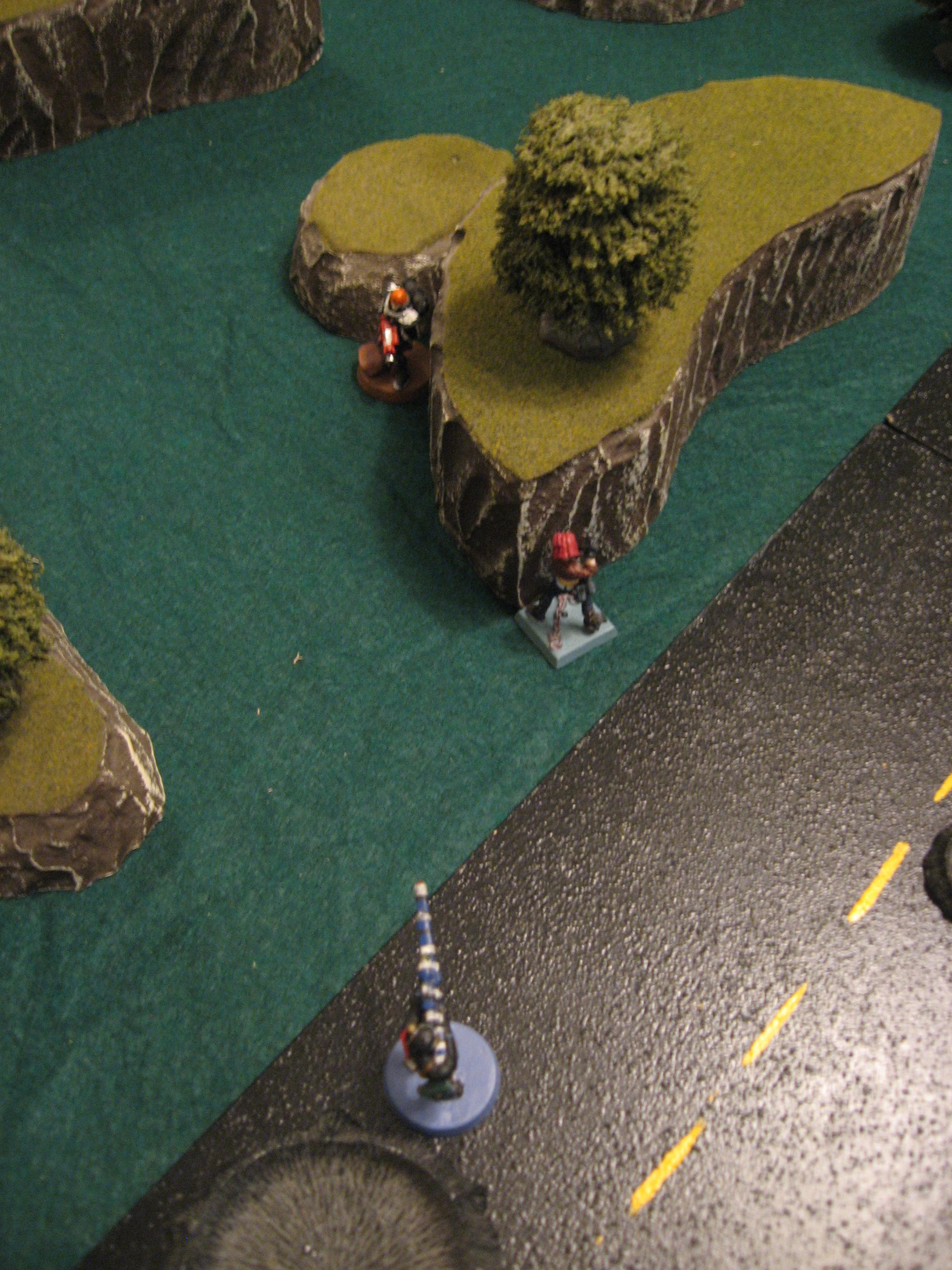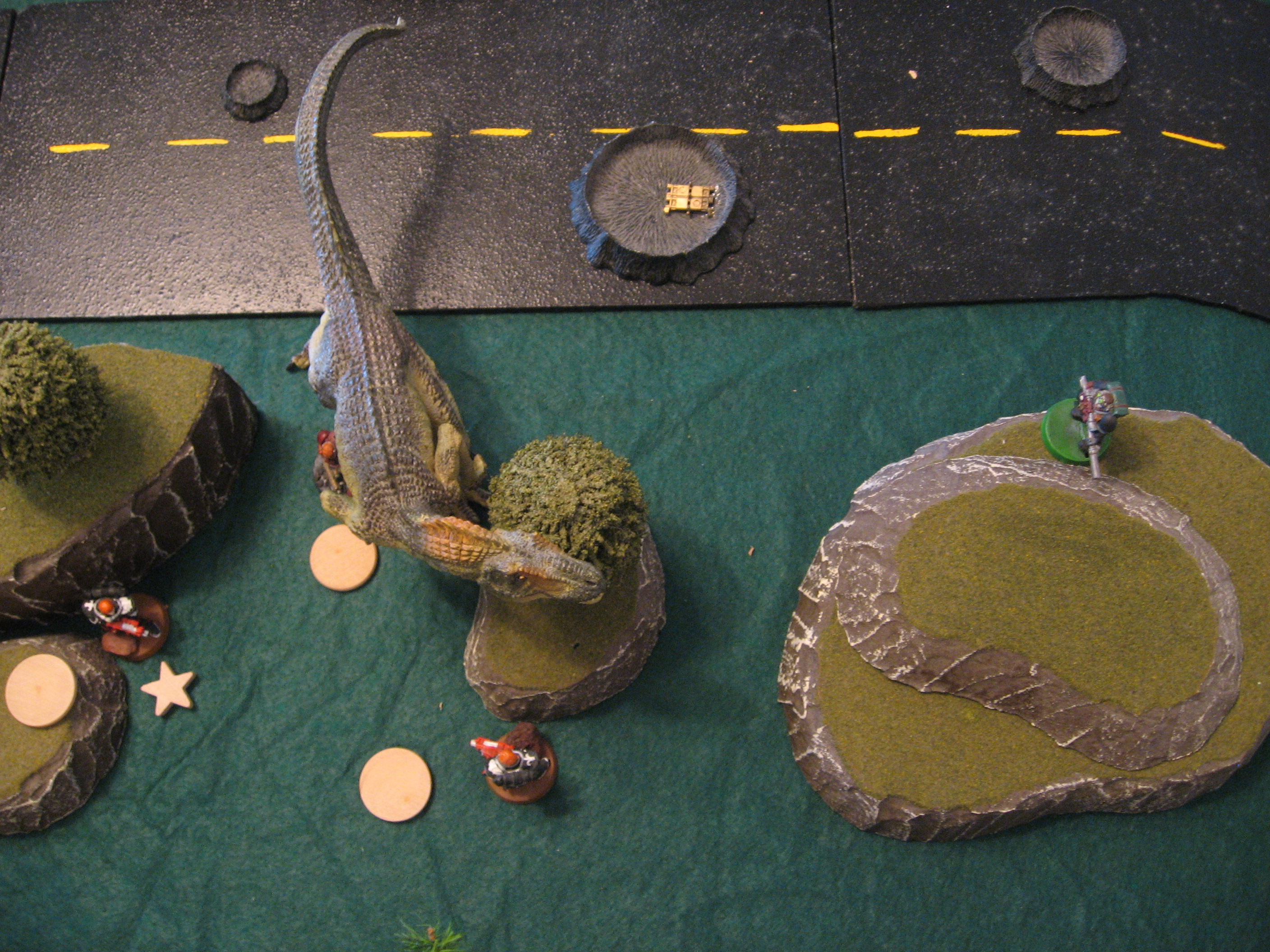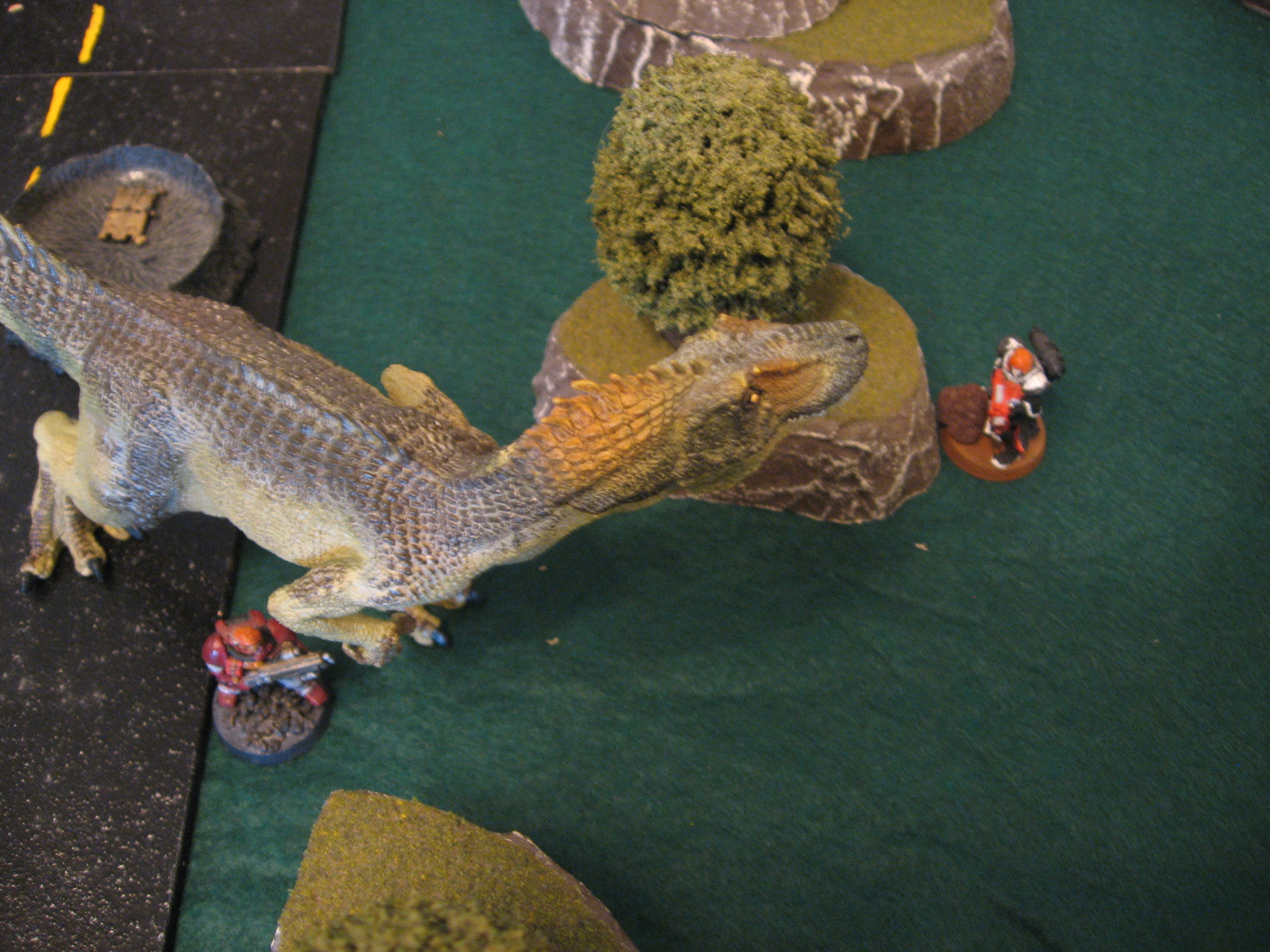 cover at the southern tip of the hill. Next turn he will be able to Run a massive 12+6″ and reach Ice in melee! I finished my turn by moving Kina to the base of the tall hill, since she had to climb up the stepping stone along the way. I was at medium range of Klahr, so I snapped off a shot. Another lucky roll with 1 critical for 3 measly damage.Death: Klahr was getting pounded, but hopefully could survive another turn and reach the relative safety of melee. Plus Kallas was safe so far, and certainly wouldn’t have survived the trip across the street, so Klahr is serving his purpose. Anyways with Ice I could just barely see Limefly’s head peaking out from behind the hill. The dinosaur was small, but not THAT small. Ice only needed 8+ to hit (so nice when the target doesn’t have Armor), so I decided to activate Knee Shot to hopefully pour on some more damage. I hit with 1 critical for a total of 9 damage, which put Limefly down to 1 HP and caused him to Panic (slowing his massive 12″ Movement to D10!). If only I had hit with just one more attack I could have killed the dinosaur and effectively stranded The Man in Black. As it stands I don’t think the pair will be effective in rushing Ice anytime soon.