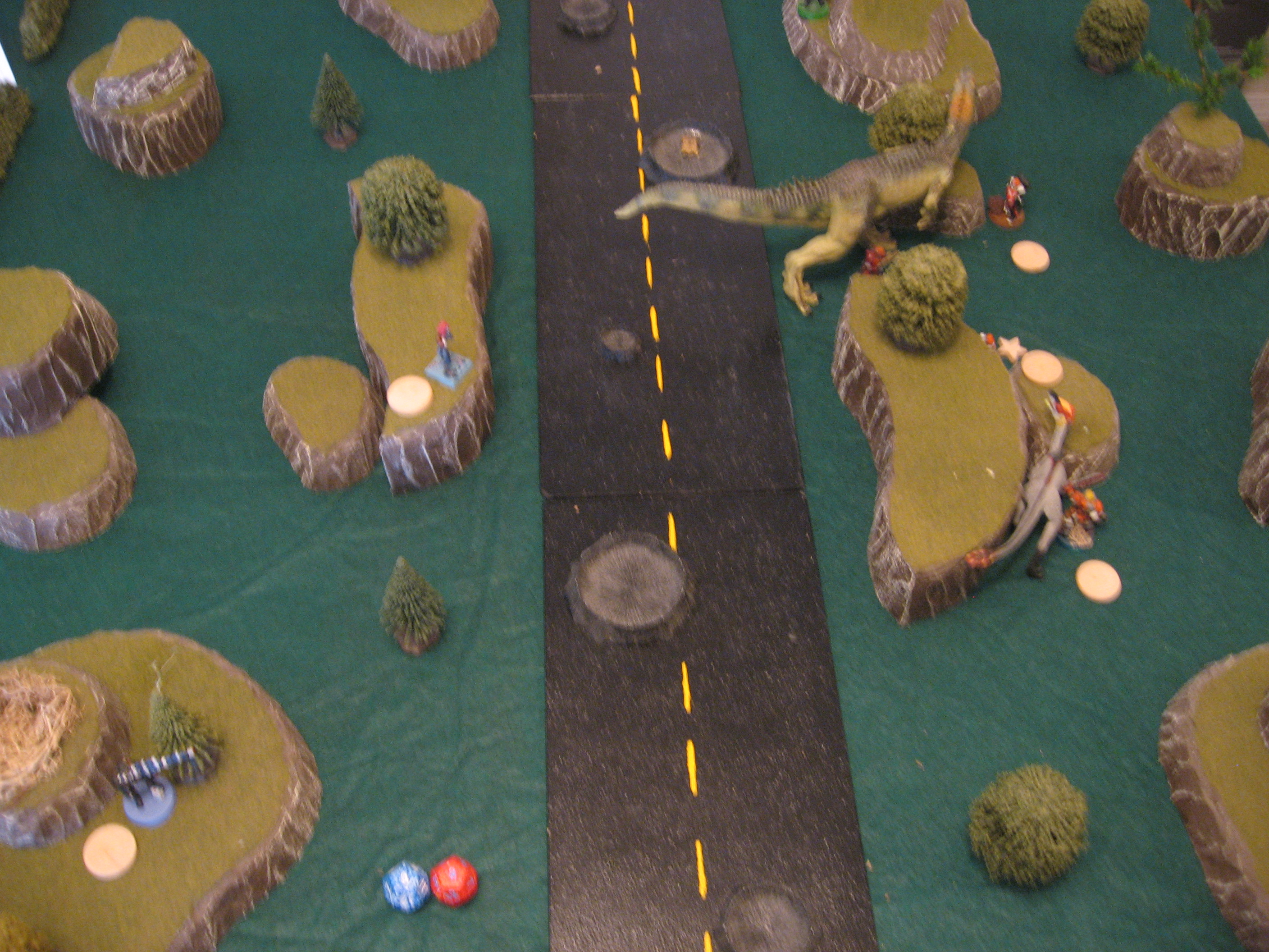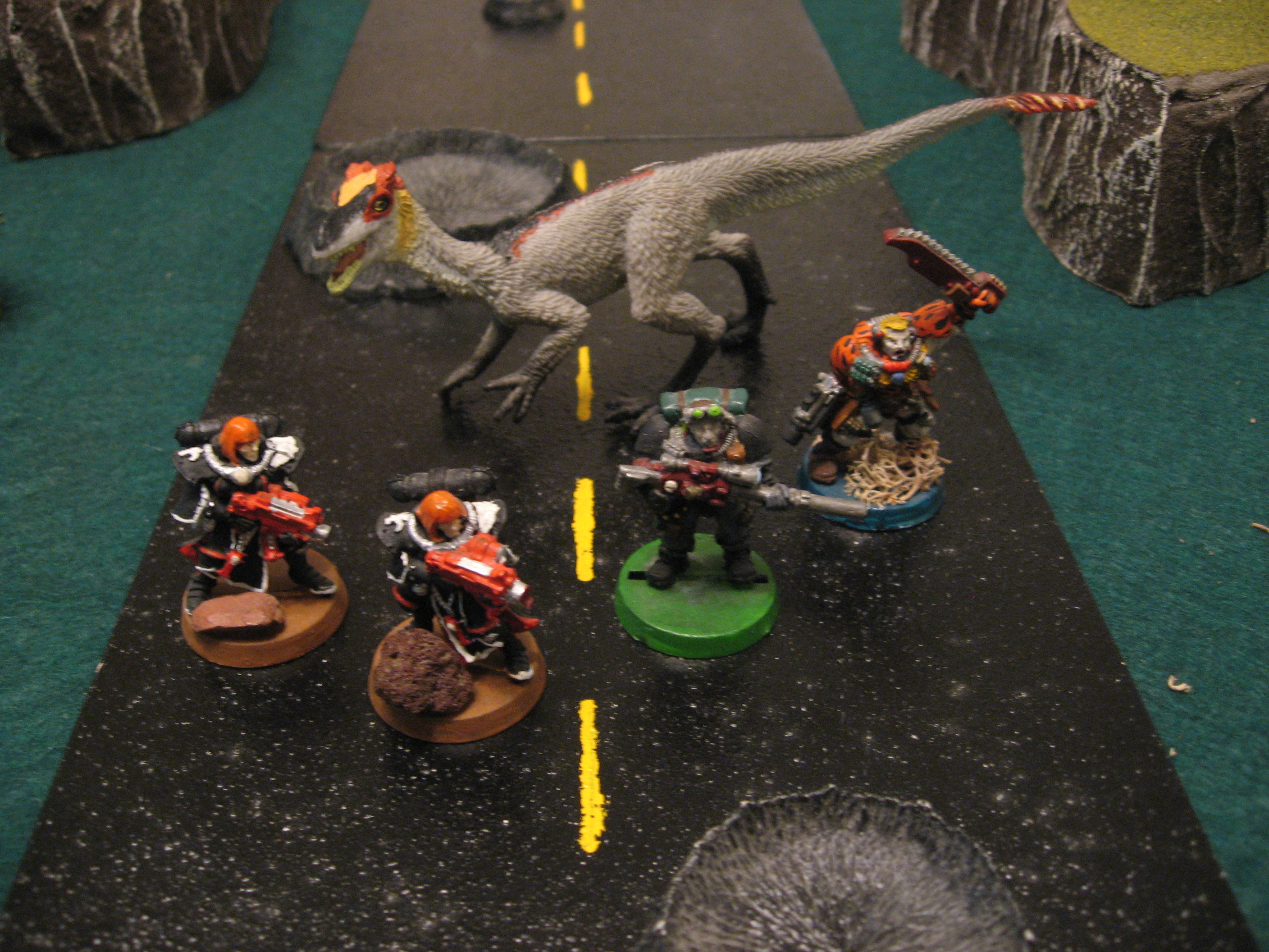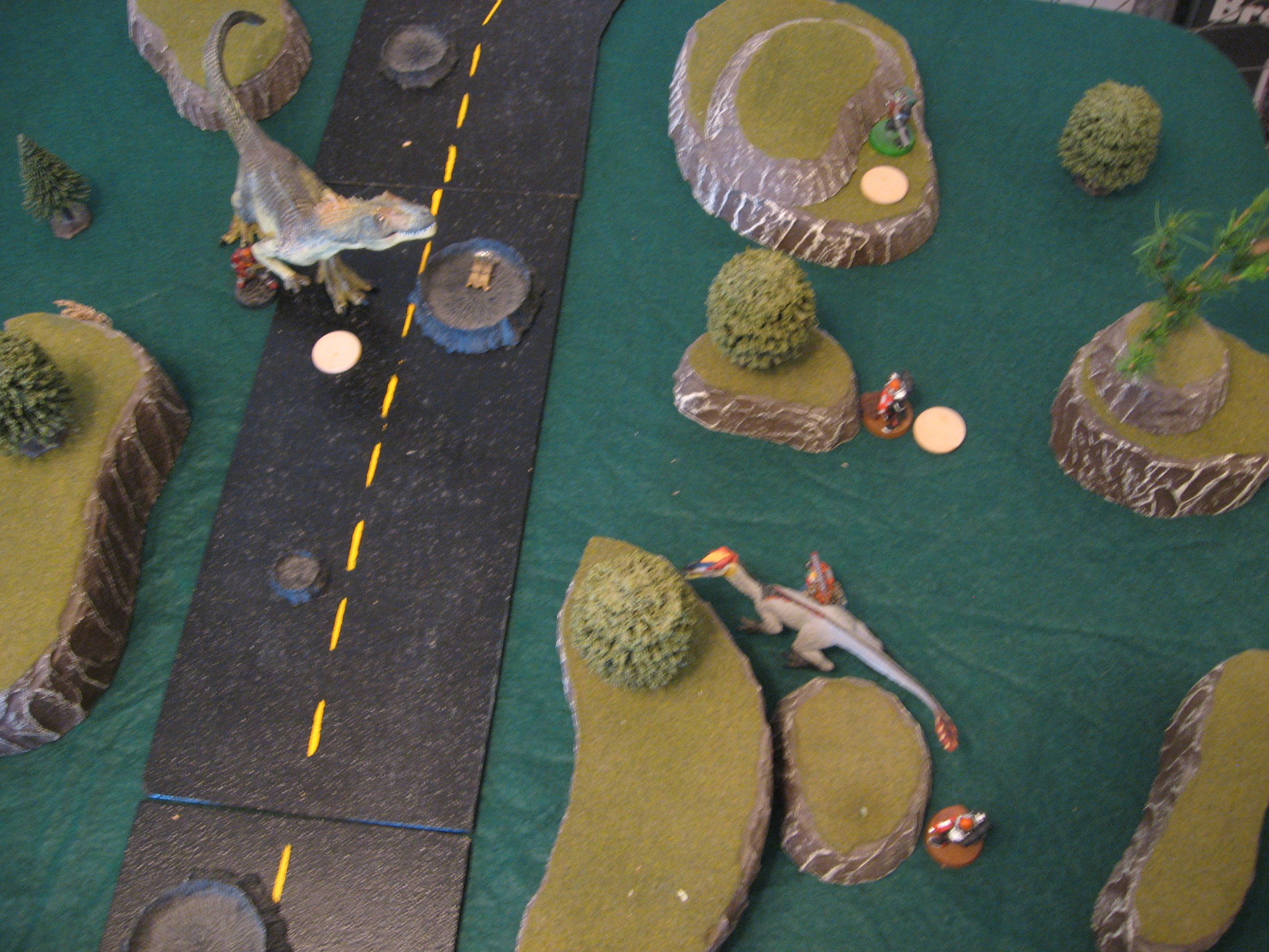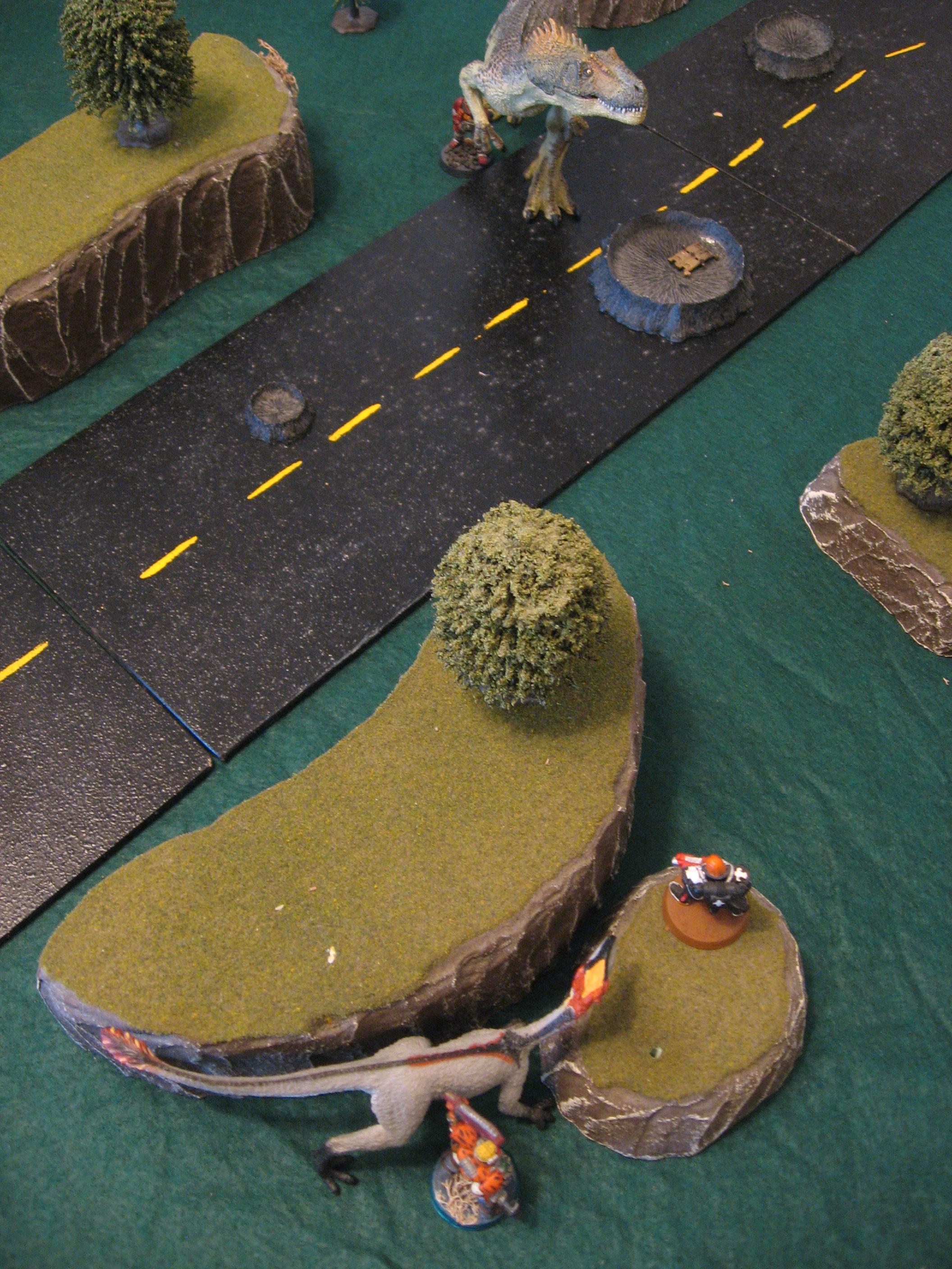 cover at the southern tip of the hill. Next turn he will be able to Run a massive 12+6″ and reach Ice in melee! I finished my turn by moving Kina to the base of the tall hill, since she had to climb up the stepping stone along the way. I was at medium range of Klahr, so I snapped off a shot. Another lucky roll with 1 critical for 3 measly damage.Death: Klahr was getting pounded, but hopefully could survive another turn and reach the relative safety of melee. Plus Kallas was safe so far, and certainly wouldn’t have survived the trip across the street, so Klahr is serving his purpose. Anyways with Ice I could just barely see Limefly’s head peaking out from behind the hill. The dinosaur was small, but not THAT small. Ice only needed 8+ to hit (so nice when the target doesn’t have Armor), so I decided to activate Knee Shot to hopefully pour on some more damage. I hit with 1 critical for a total of 9 damage, which put Limefly down to 1 HP and caused him to Panic (slowing his massive 12″ Movement to D10!). If only I had hit with just one more attack I could have killed the dinosaur and effectively stranded The Man in Black. As it stands I don’t think the pair will be effective in rushing Ice anytime soon.