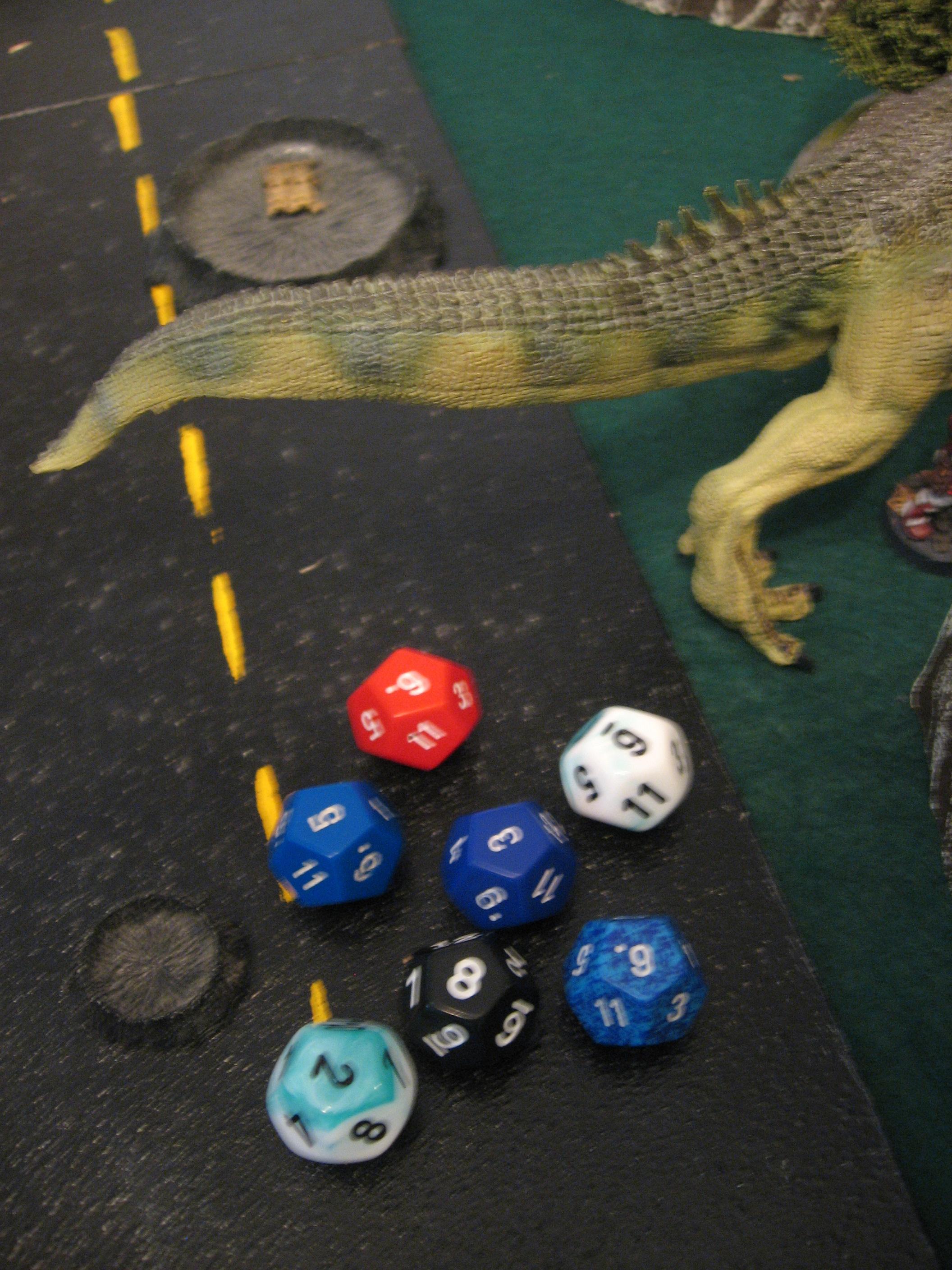 Sunset: Phew I lucked out winning Activation, since it meant I could have Limefly dive for cover before Ice got another shot off. I rolled for Limefly’s PMV and got a 2! So he basically went from 12″ MV to 2″ :( Anyways I shuffled him around until I was sure Ice couldn’t see him, or move to see him. The Panic was cleared after this, but I didn’t know what to do with the gravely wounded dinosaur now.