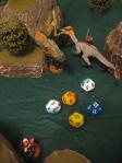 Death: Time to move in the spearhead forward! Kallas spurred his mount Klahr forward behind the tall hill. It provided some cover from the middle of The Sunset Rider’s forces, but Old Jim had a pretty clear shot (unfortunately). Not much I can do to prevent that with such a massive dinosaur.