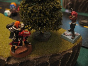 Death: Jordana spun and fired at short range against Kina, hitting 2 times for 4 damage as the vegetation absorbed some of the shot. Jordana moved to the bottom of the hill but didn’t have enough Movement to reach the top…yet.