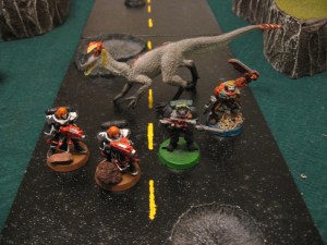For the roll off to decide table edges The Sunset Riders got the right side (west) and The Death Snakes got the left side (east). The Death Snakes had to setup first. As mentioned the deployment zone was 5″ from each table edge. There was no objective for the game, since the street would inspire enough strategy without artificial goals.