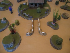 My general plan is to move Toma and Scatterman forward on one flank, with Homer on the other. They would hopefully pace each other and reach the cabin at the same time. Grove would hang back a bit behind Homer and could readjust his position to any changes on the battlefield. And Tenpas Terako would sit just at long range and snipe at the cabin’s occupants.