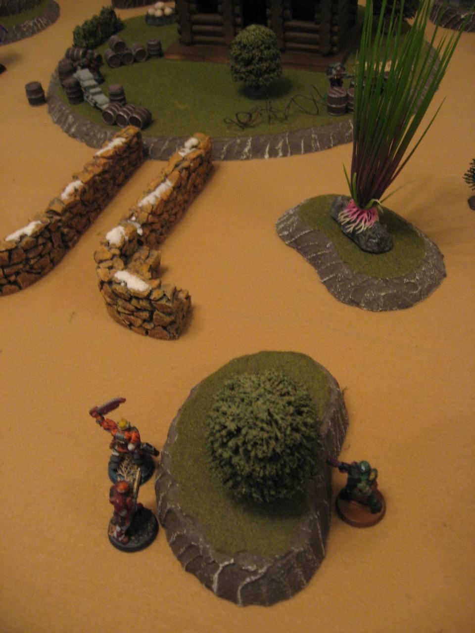 Family: Another Activation and another chance to get revenge. Private Verhust had liked Brother Jerrid’s eagerness to hear stories of inside The Wall, so he also wanted revenge. But in his case it was blind revenge, so all he did was shoot at Scatterman. Some bad rolling meant I missed all the shots AND had to Reload. I finished up by moving Private Verhust towards the cabin door, but still right behind the nice tree outside.Rexburg: Time for Scatterman to show the traitor what real shooting is. I moved Scatterman his full 4″ forward which put Private Verhust into long range. The massive Auto Shotgun barked to life and hit 2 times (1 was a Critical) but also a 1 was rolled so a Reload will be needed. Captain Toma is right by Scatterman though so he uses “Yeehaw!” to let Scatterman re-roll his Reload roll of a 1. The re-roll is still a miss but at least his Auto Shotgun will be ready for next turn. Anyways in total Scatterman did 7 damage (8 – 1 for Cover) to Private Verhust, who is now Fleeing.