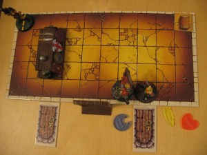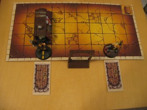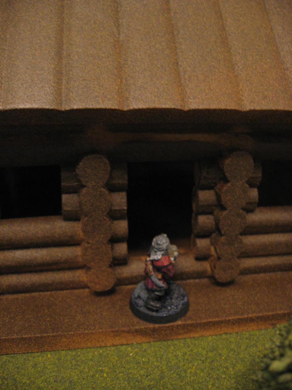 As a twist I used old Advanced Heroquest game tiles to represent the interior of the cabin (since the roof of the model doesn’t come off), which allows for a new dimension to the game. As you can see from the picture I mirrored the outside of the cabin, so the door and both windows are marked. I didn’t have much interior furniture but I did put a table along the edge as a sort of barricade, and a chest in the corner for flair. The game tile I used is 10 squares by 5 squares, and I played as if each square was 1 inch to help ease managing movement inside the cabin.