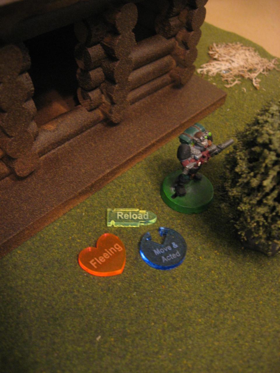 For this game I wanted to build a scenario around the table I setup, which included new barrels, a cabin, and the first use of my new Litko tokens (pictured to the right. They turned out great!). But specifically the focus would be the new wooden cabin I had bought and spraypainted. And of course what better use for a cabin than a raid or siege! I took a note of Ruby Ridge and Waco Texas and specifically the movie Arlington Road which drew heavily from both. To that end I wanted a group of Neotechnoists to assault a Duster farmstead.