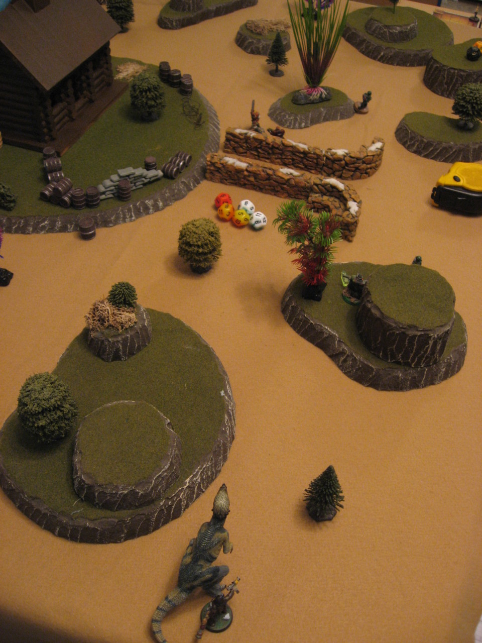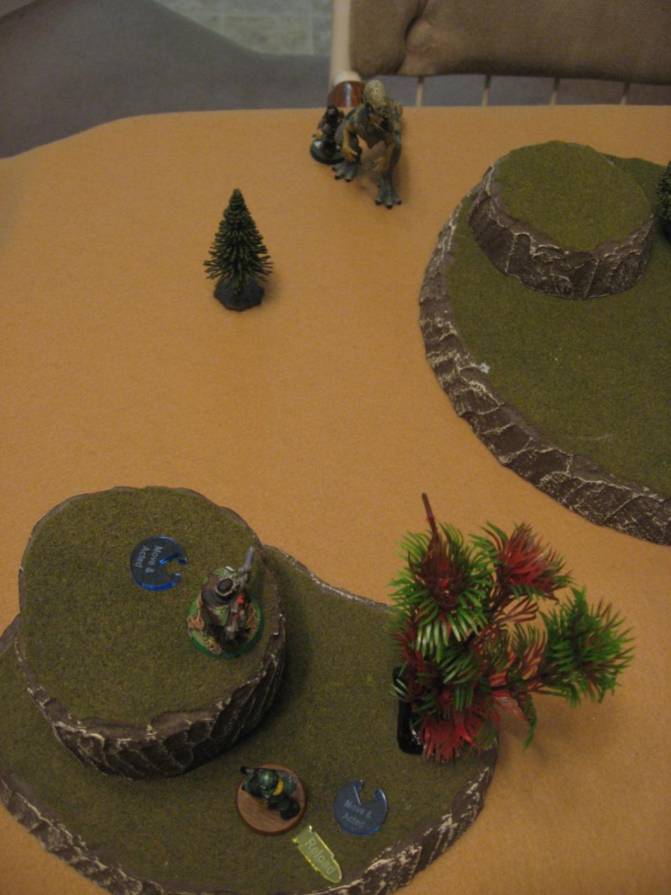 At this point the game concluded. We hadn’t decided on rules for dinosaurs getting into the cabin, so we weren’t sure if Bluepatch would be able to reach Homer. I think that Homer would likely throw a grenade and it would scare of Bluepatch, since no humans were around to direct the dinosaur. All in all both players decided it was a draw.