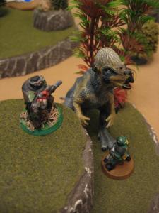 Rexburg: Tenpas heard the roar of the angry Thickskull and quickly spun to see Papa and Bluepatch rustling out of the jungle. Using Speed Reload he quickly pushed new batteries into the Twin Rifle and took aim at Papa Jonas. Tenpas hit 3 times for 6 damage (5 + 1 for Elevation). Due to Papa Jonas’ massive HP pool he didn’t even need to make a Bravery Test for such high damage.