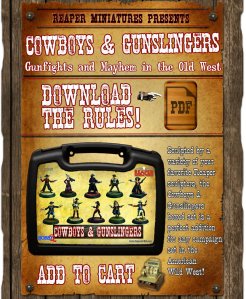 An interesting new initiative by Reaper Miniatures, a favorite company of mine due to their great and varied Chronoscope line of figures. This initiative is to graft their RAGE rules system (used in Warlord) onto a Wild West scenario, offer those rules for free, and then sell a bundle of their best cowboy models. Basically 10 models for $39.99 (at least where I am). They have this package listed as a new game, so I wonder if they’ll expand the rules in the future.