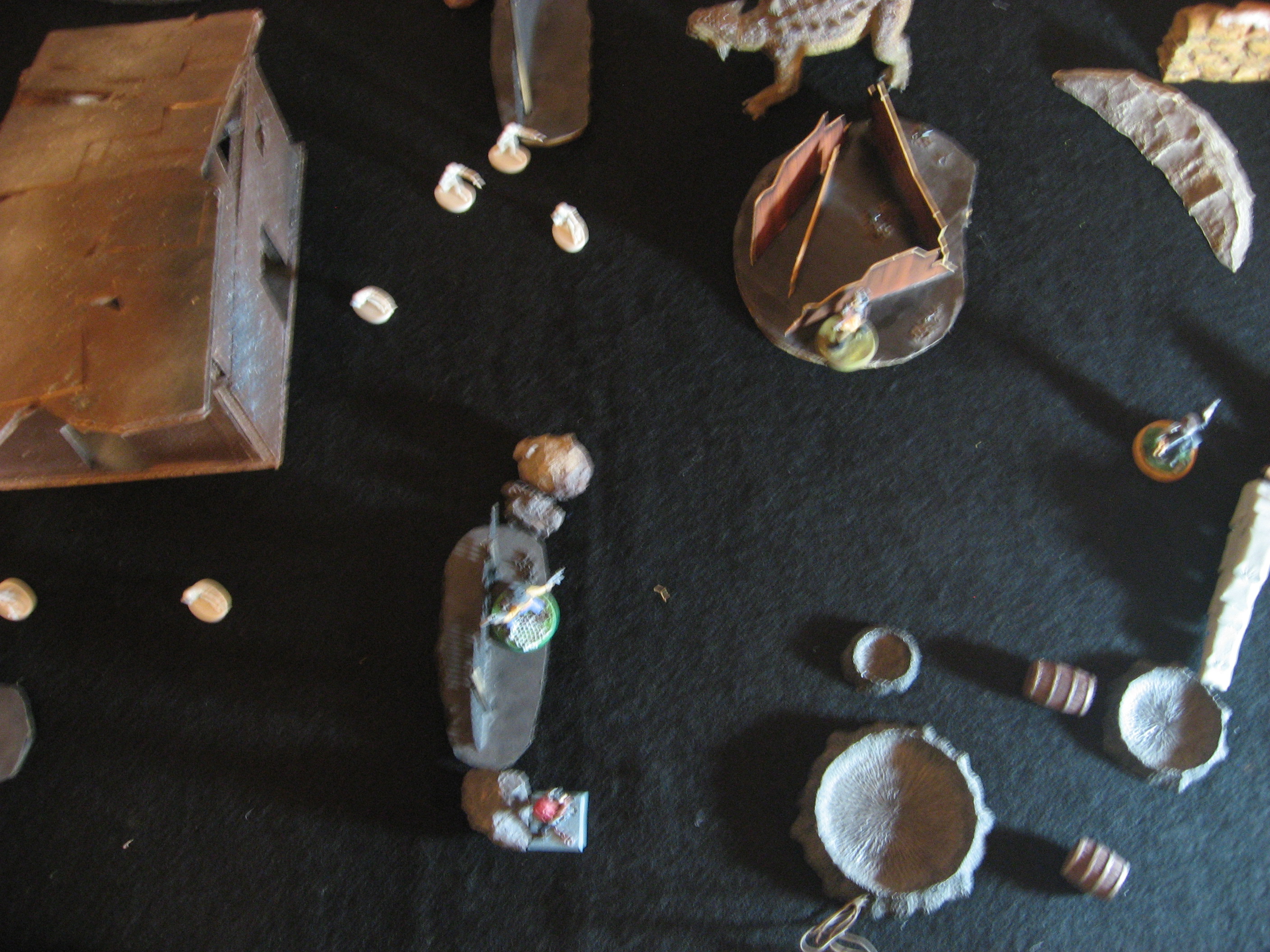 T1: Having seen the shambling Undead arise from the Bunker the various members of the posse grit their teeth and await the onslaught. These are no amateur dinohands though, and four Pioneers drop from the combined fire of everything but Gin (who was out of range). Of those kills only a single Pioneer even got to roll their Dark Power (which they failed), since the rest of the damage was far above 6. Coyote especially impressed me, as he would the rest of the match, with a powerful opening salvo of two Criticals and two high hits.