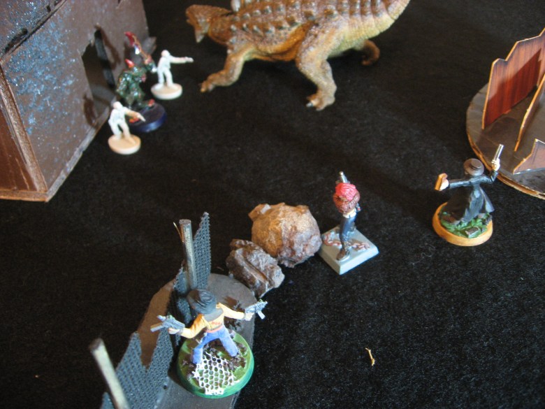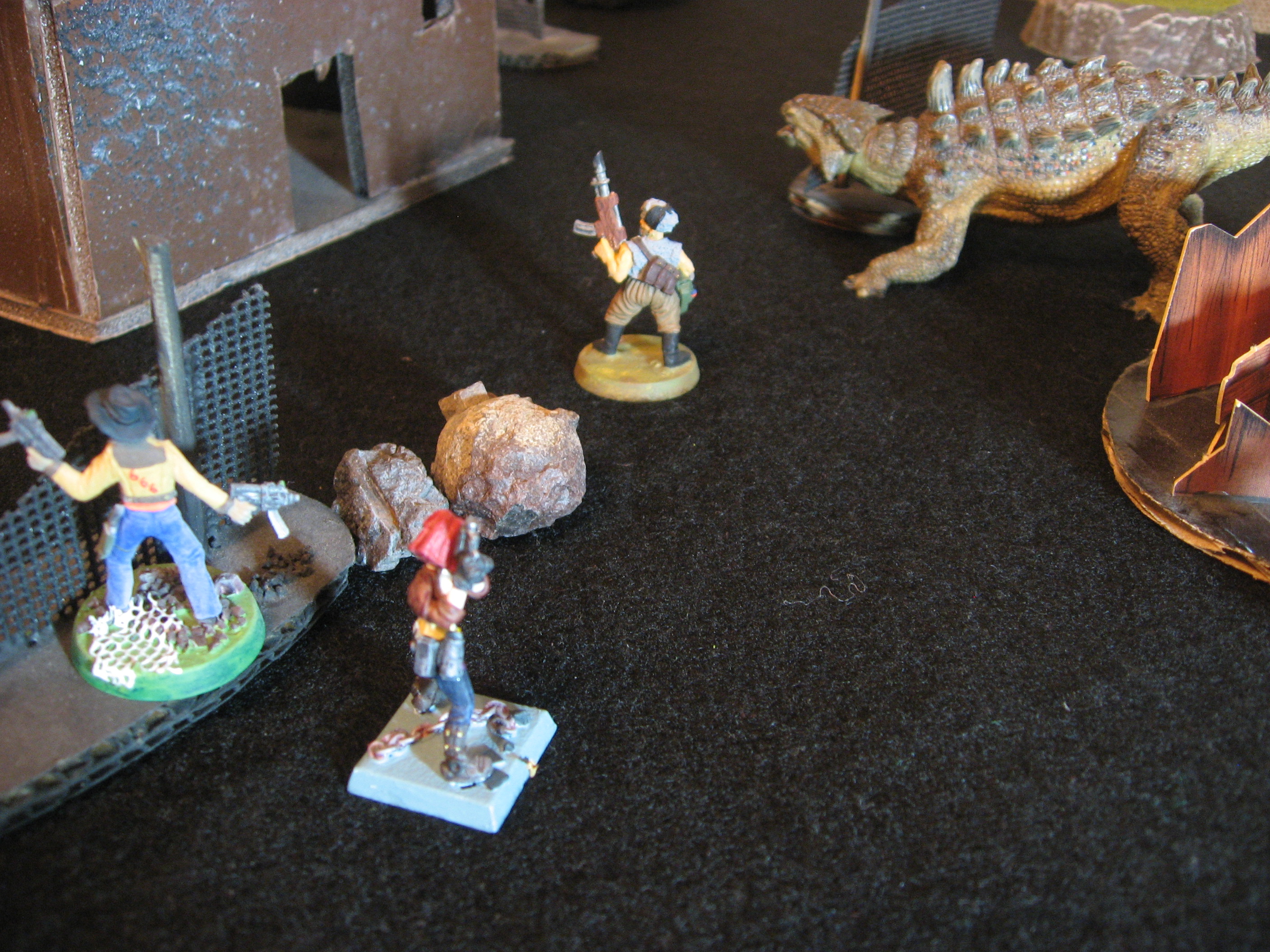 Vladizlov and Trista Camus are old classic figures to me, since I’ve used them for everything from post apocalyptic to zombie hunting (see, they are veterans in the field) to my very first Dinosaur Cowboy battle report! Vlad got his usual Assault Rifle, but also a pack of Riot Grenades to represent the demolition pack his figure has. Trista got her usual 400kW Lever-Action Rifle and a backup six-shooter. Bandit for Vlad, Neotechnoist for Trista (poor Trista never gets above 12 HP).