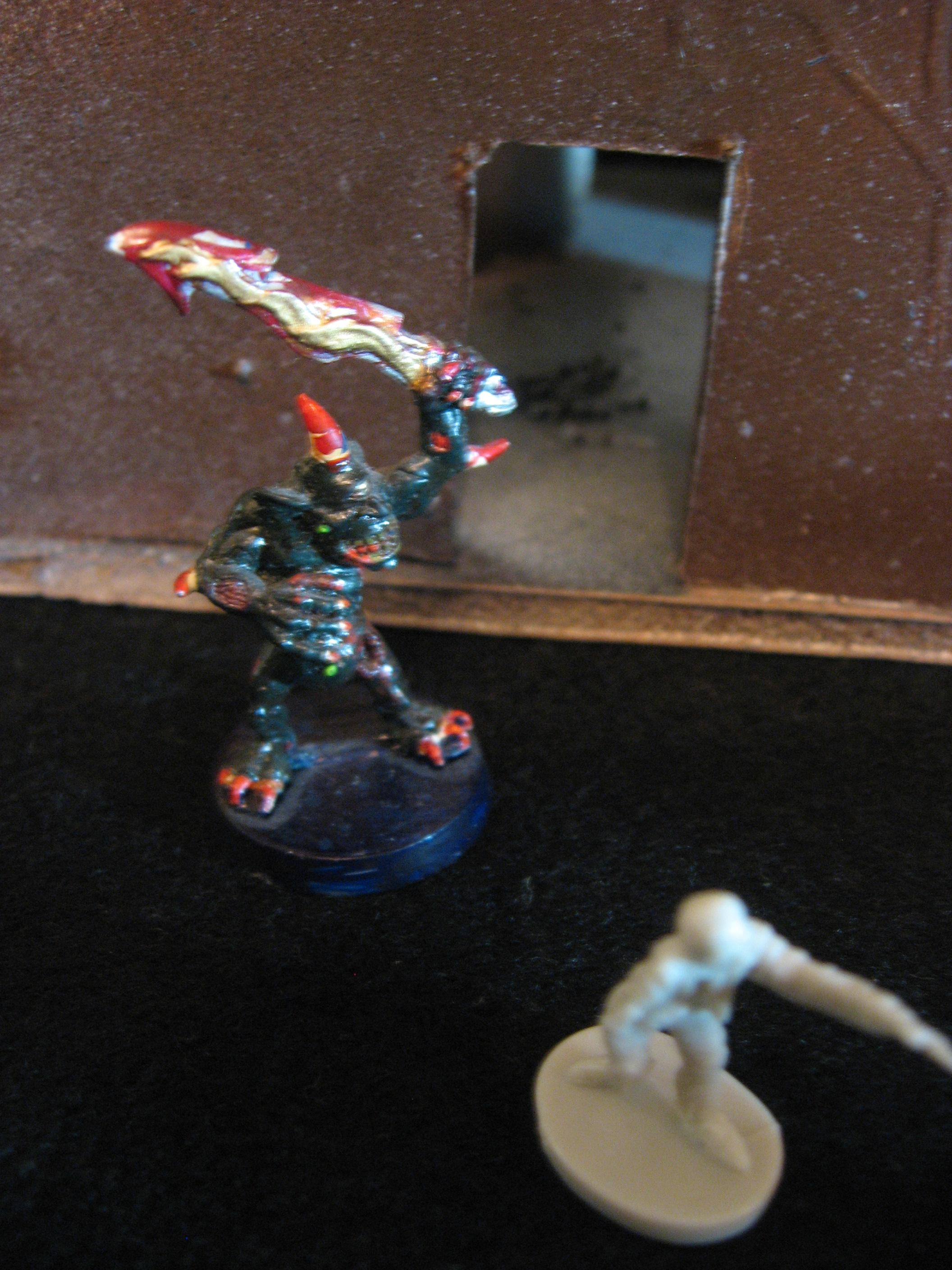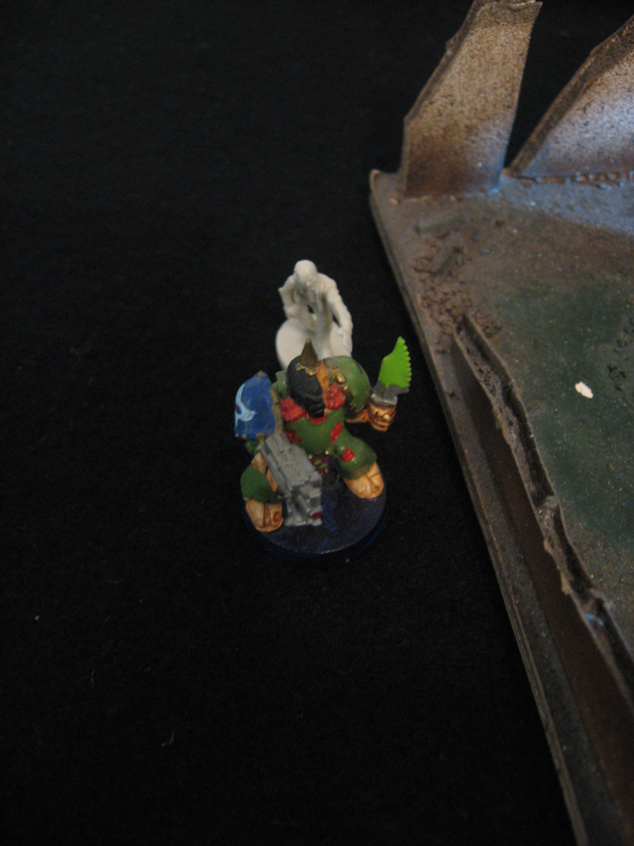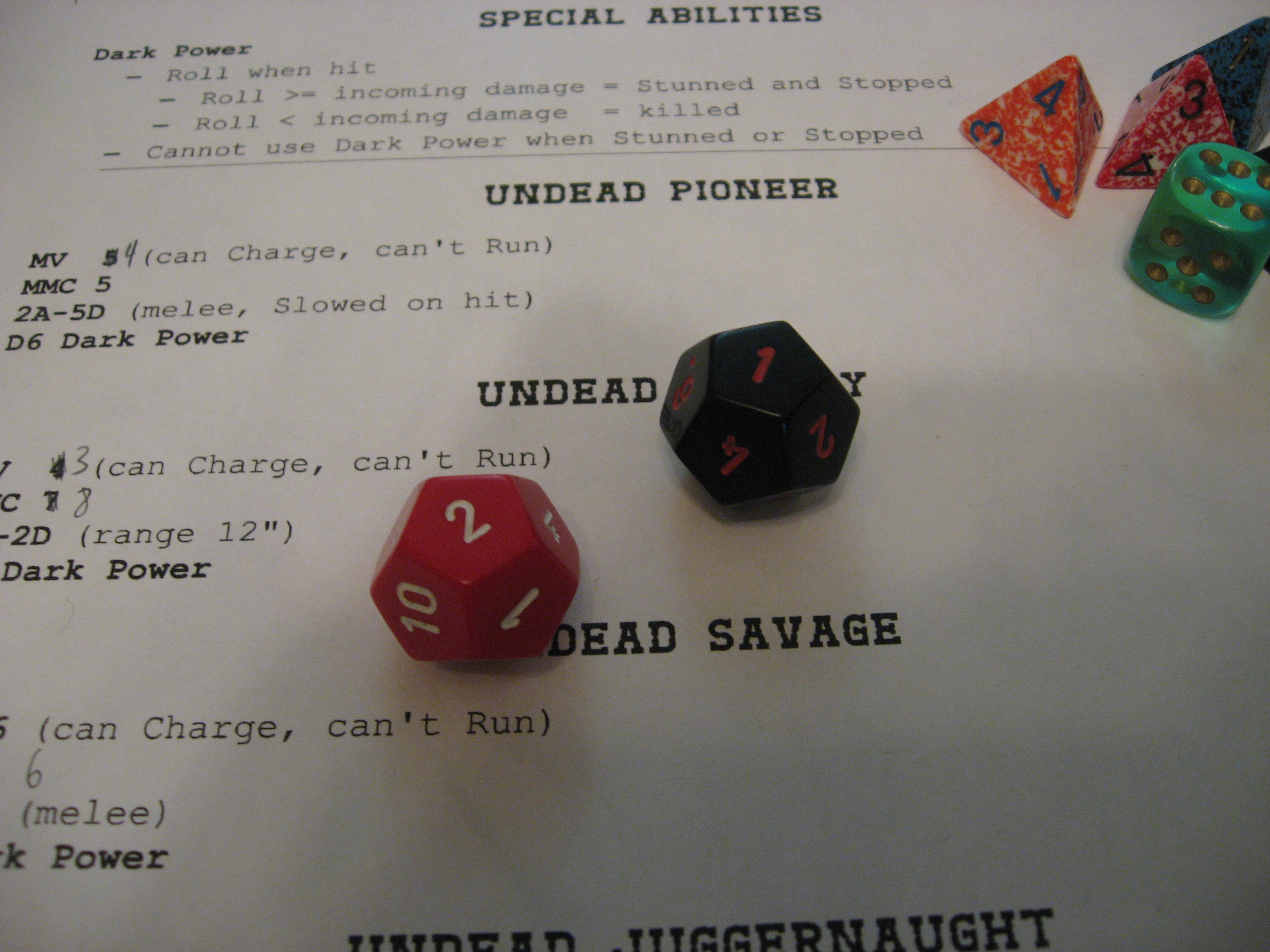 Here are the details on how the Undead played, as well as a picture showing who is who (and yes, that is a 2nd edition Warhammer 40,000 Plague Marine). The only difference in statistics between my game and the Halloween Supplement is my Juggernaughts only had D8 Dark Power.