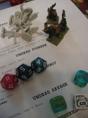 Undead Deployment: D6+4 Pioneers and D3 Savages start within 6″ of the Bunker on a random side. This ended up being 10 Pioneers and 2 Savages. Each Undead rolled a D4 on Spawning for the direction from the Bunker they started at, with 1=north, 2=east, 3=south, 4=west