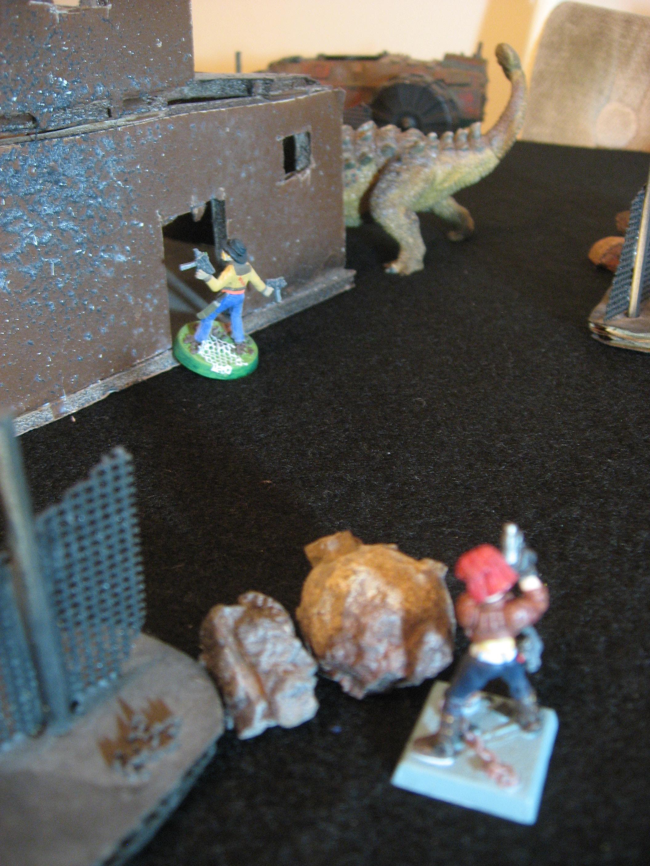 T4: The ground shakes as Mace finally reaches a witless Pioneer. Spinning furiously the Armored dinosaur smashes the Undead into pulp. Guns roar around him as Gin shotguns another Pioneer, while Alson edges into the cover of the rocks and downs a third Pioneer. Coyote levels both Stub Pistols and riddles the lone Juggernaught full of holes for 8 damage. Trista takes some time to reposition, Running forward to get into her optimal range.