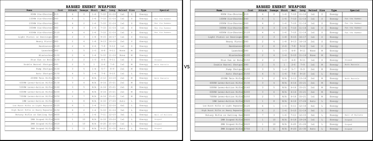 I also added alternating shading to the various item charts. I am honestly not sure why I didn’t have that right from the start. Reading wide tables without any color differentiation is rather tough. I also added a splash of green color to match the blank posse roster. Anyway a quick preview of the old vs new chart: