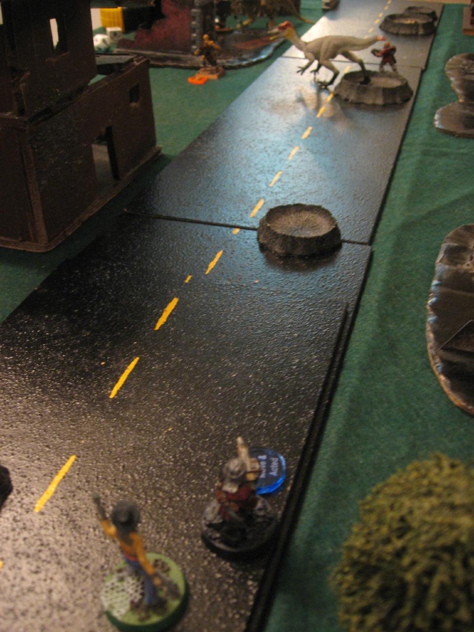 Meanwhile, stirred by a dinosaur aggressively moving towards it’s master, Jungle Fang boldly strides up the road and easily succeeds at Charging the unsuspecting Quidel. The Raptor lunges and lands on top of Quidel, clawing and tearing wildly. Quidel takes 7 damage from the attack and fails his Bravery Test!