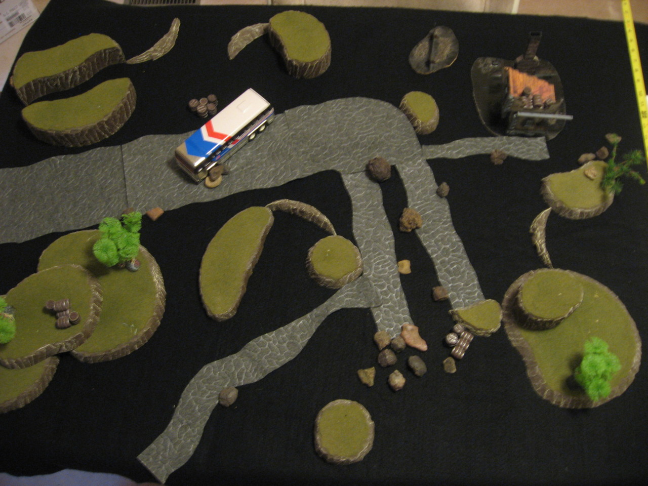 My notes for this battle are…sparse. As in not even a page. But the pictures speak volumes. I think the table looked really good this time, as I went for slightly lower hills, the black mat (to represent the dark hills around Hyran Mine), an old abandoned bus (which I always love), and best of all I got to use my new inexpensive roads! Brief sidenote, the roads are made by cutting out textured fabric from a local craft store. They look good (especially for the price) and the cobblestone really pops on them. I cut a few to be main roads and a few to be little side trails, so lots of variety. Now that I’ve (successfully) tested the roads I think I’ll try to get more fabric in the near future and make even more roads.