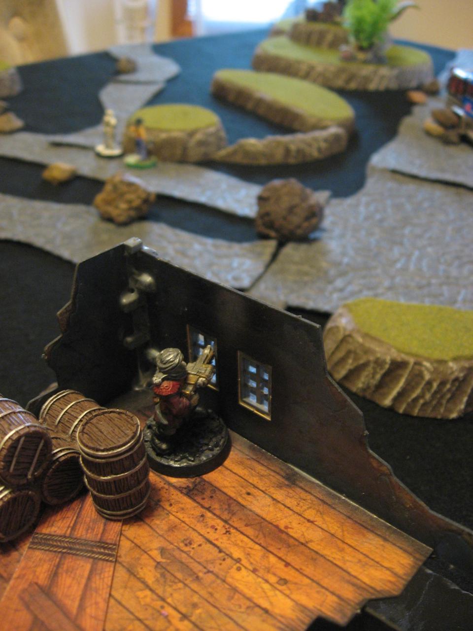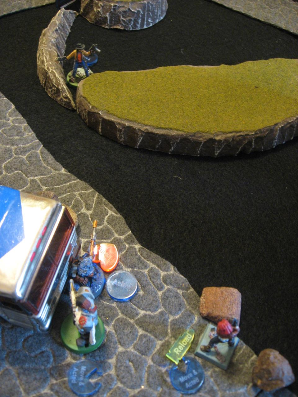 I had the Drylands Expedition start “Out of Supplies”, to represent their haste from running from Hyran Mine. That meant they would start with all weapons needing a Reload. So the first turn would be catching their breath and moving to better positions while reloading their weapons.