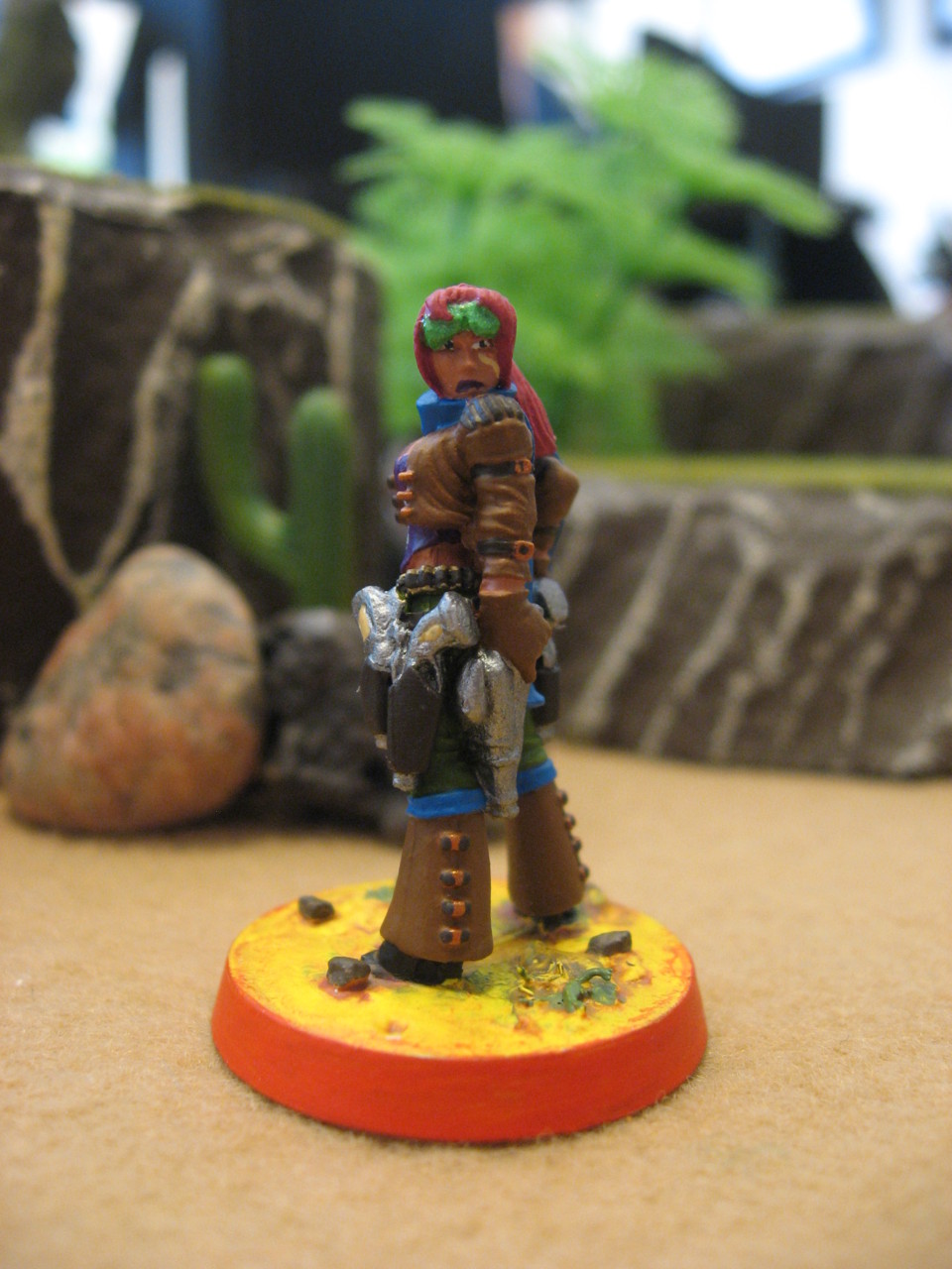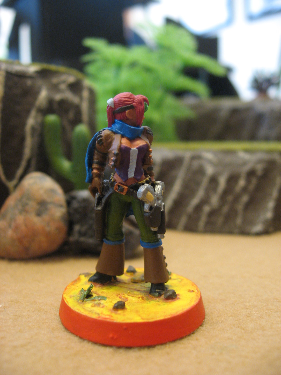 Well I’ve had this mini for a long while, and always loved the dynamic pose and brace of pistols. Back in the Windy River test campaign (which seems so long ago!) I had hired a character named Sarah Love with the intent of using this mini. Well I finally sat down and painted her.