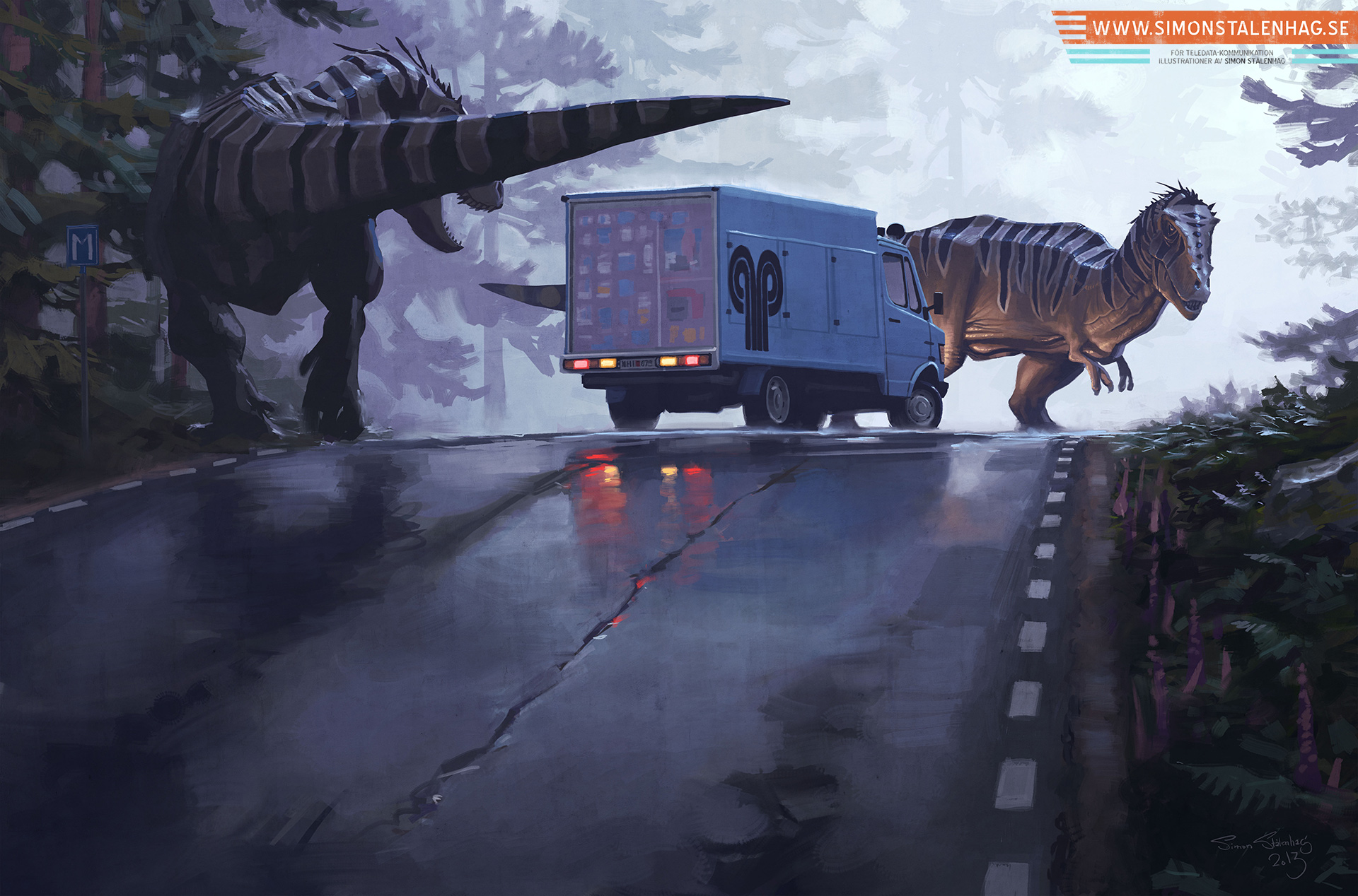 There are a couple of dinosaur related pieces that the artist Simon Stalenhag has done, as well as some really imaginative robot related work. All in all a nice dark style with moody forests and the suggestion of tense situations. All the images below came from his website, where you can visit and view more: