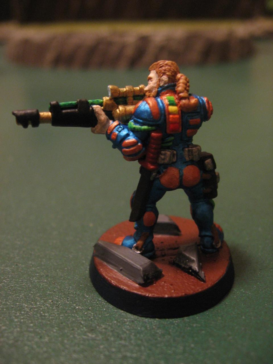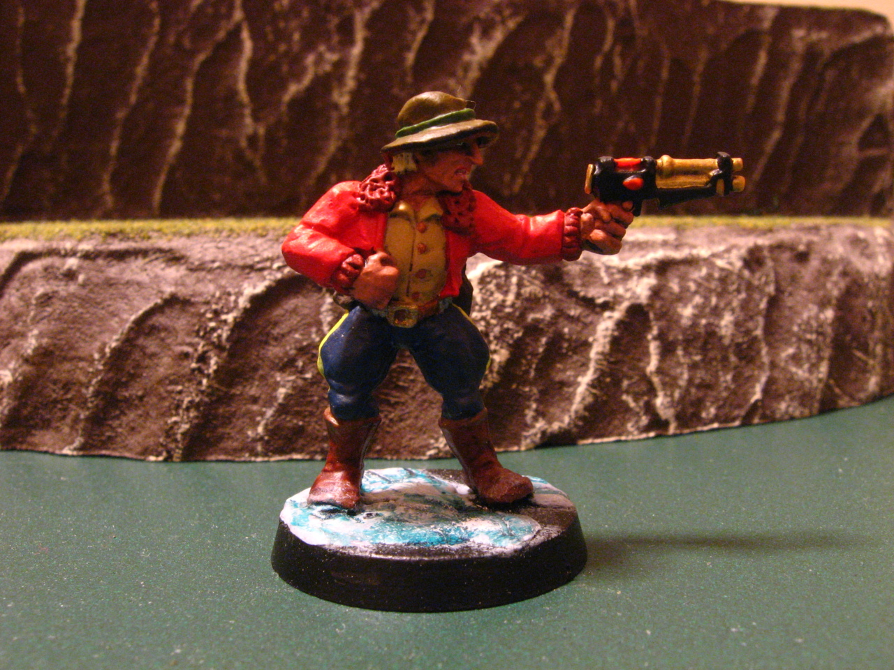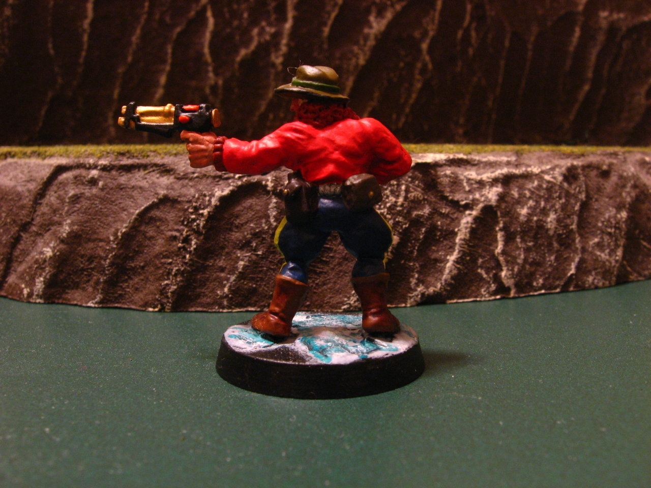 And finally is another Games Workshop mini, of course not even remotely recent (screw those prices!). Best I can tell this guy is a Rogue Trader (ie: Warhammer 40,000 first edition) era mini, some kind of Imperial settler or colonist. Either way he basically looks like a farmer Han Solo, and certainly has a dated look to his sculpting (such as his bulgy jacket and squat stature). Great pistol though, and I decided to paint him like an RCMP / Mountie, which just semeed to fit for some reason. So that meant a blue stripe on the pants and a red jacket. His shirt, while not a wild color, turned out nicely with the copper buttons.