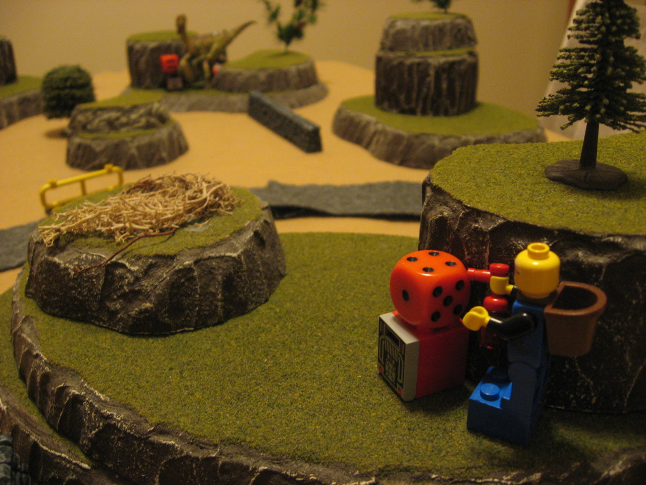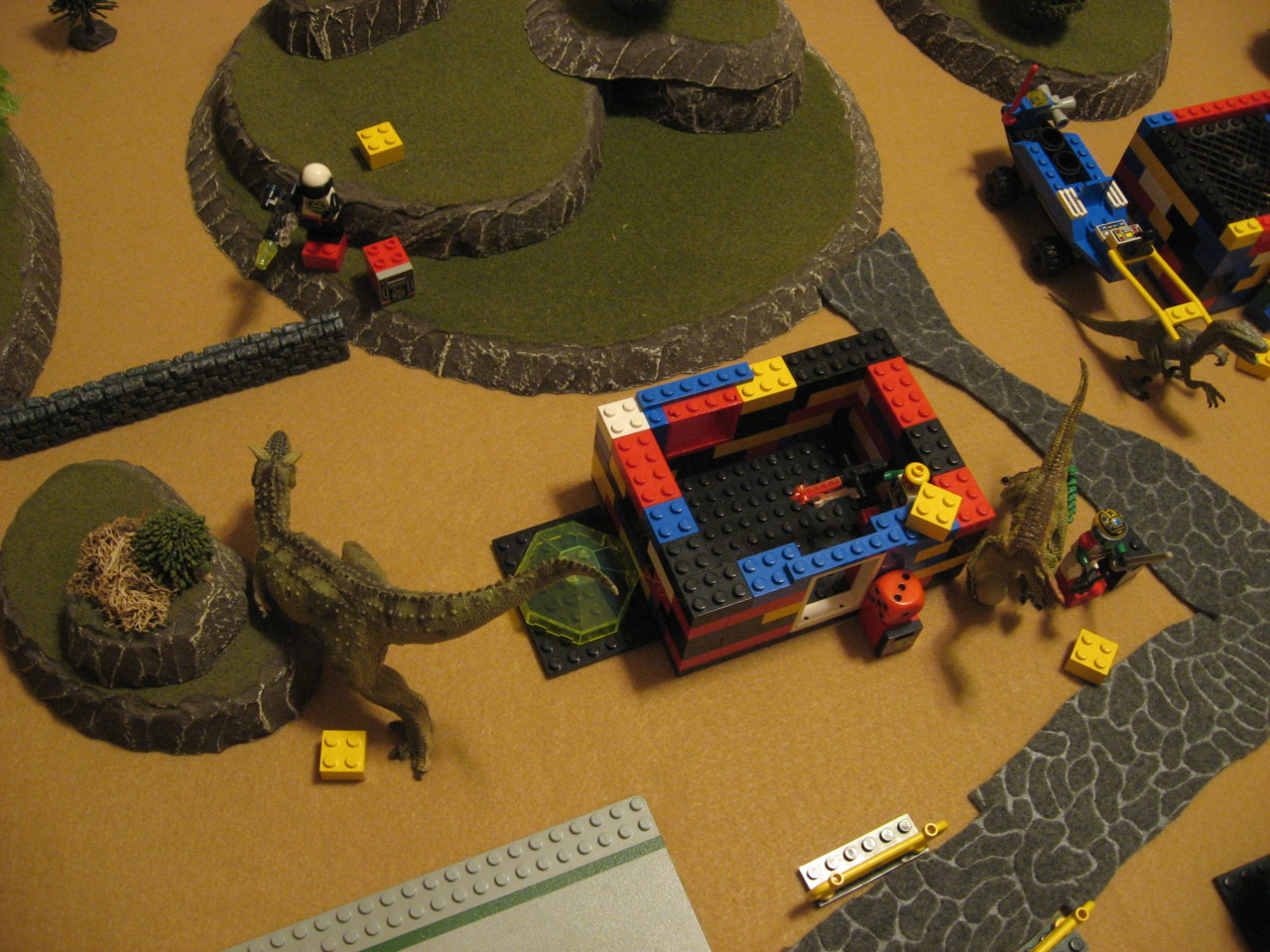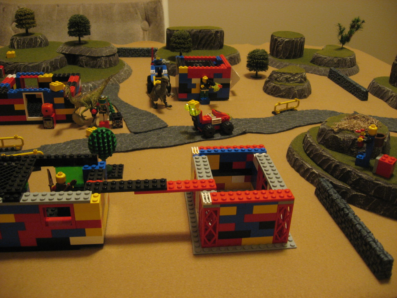 Boom, it happened, I finally sat down and played Dinosaur Cowboys with Lego Minifigs like I’ve been meaning too since September (jeez has it been that long?!?!). I’ve had all these Lego buildings sitting around just waiting to go. So last week I set everything up, scrounged up enough vaguely weaponized Lego pieces, wrote two full 5 man + 1 dino posses, and played (using v2.5 of the rules). Of course the town used here is different than the one I took pictures of in September, obviously because I’m not going to leave the first town setup for ~6 months haha. I have a few Lego fences and trees that also made an appearance in addition to my normal terrain.