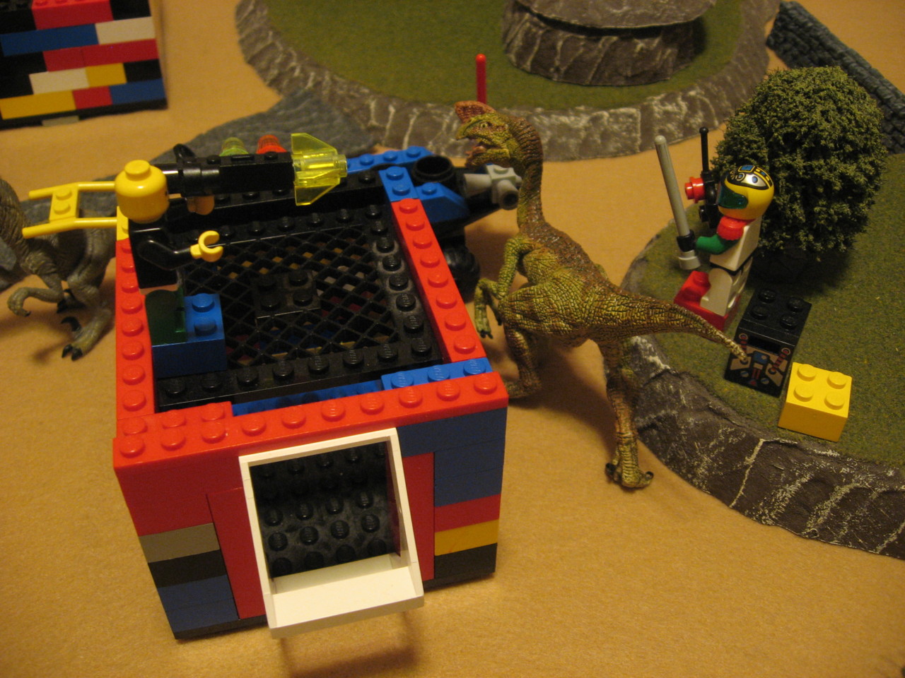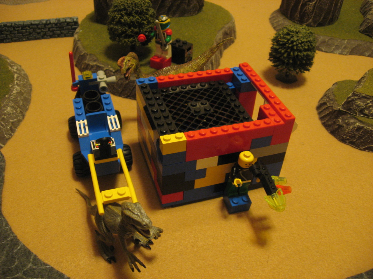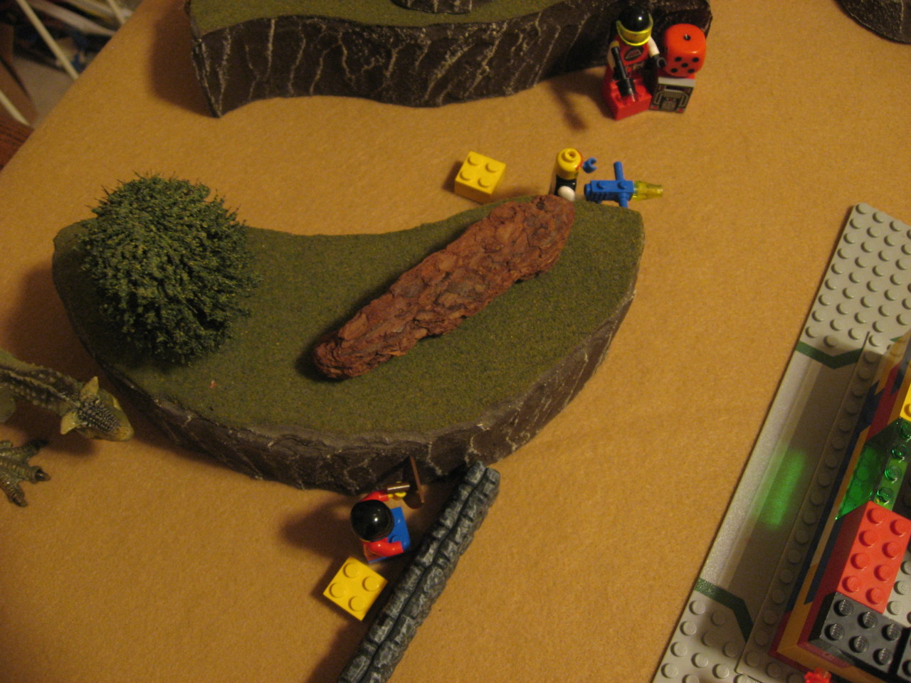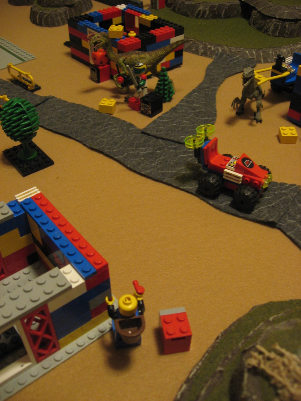 Boom, it happened, I finally sat down and played Dinosaur Cowboys with Lego Minifigs like I’ve been meaning too since September (jeez has it been that long?!?!). I’ve had all these Lego buildings sitting around just waiting to go. So last week I set everything up, scrounged up enough vaguely weaponized Lego pieces, wrote two full 5 man + 1 dino posses, and played (using v2.5 of the rules). Of course the town used here is different than the one I took pictures of in September, obviously because I’m not going to leave the first town setup for ~6 months haha. I have a few Lego fences and trees that also made an appearance in addition to my normal terrain.