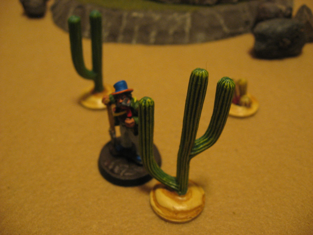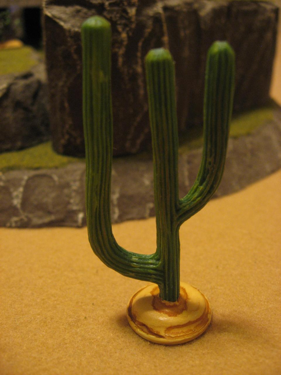 A while back I randomly stumbled across some model cacti (in a nearly empty hobby shop I had never been to before). They were great, perfect scale, prepainted, and so I picked them up immediately. The only downside was they had tiny bases, and some were quite top heavy and wouldn’t sit very well on my desert cloth for the gaming table.