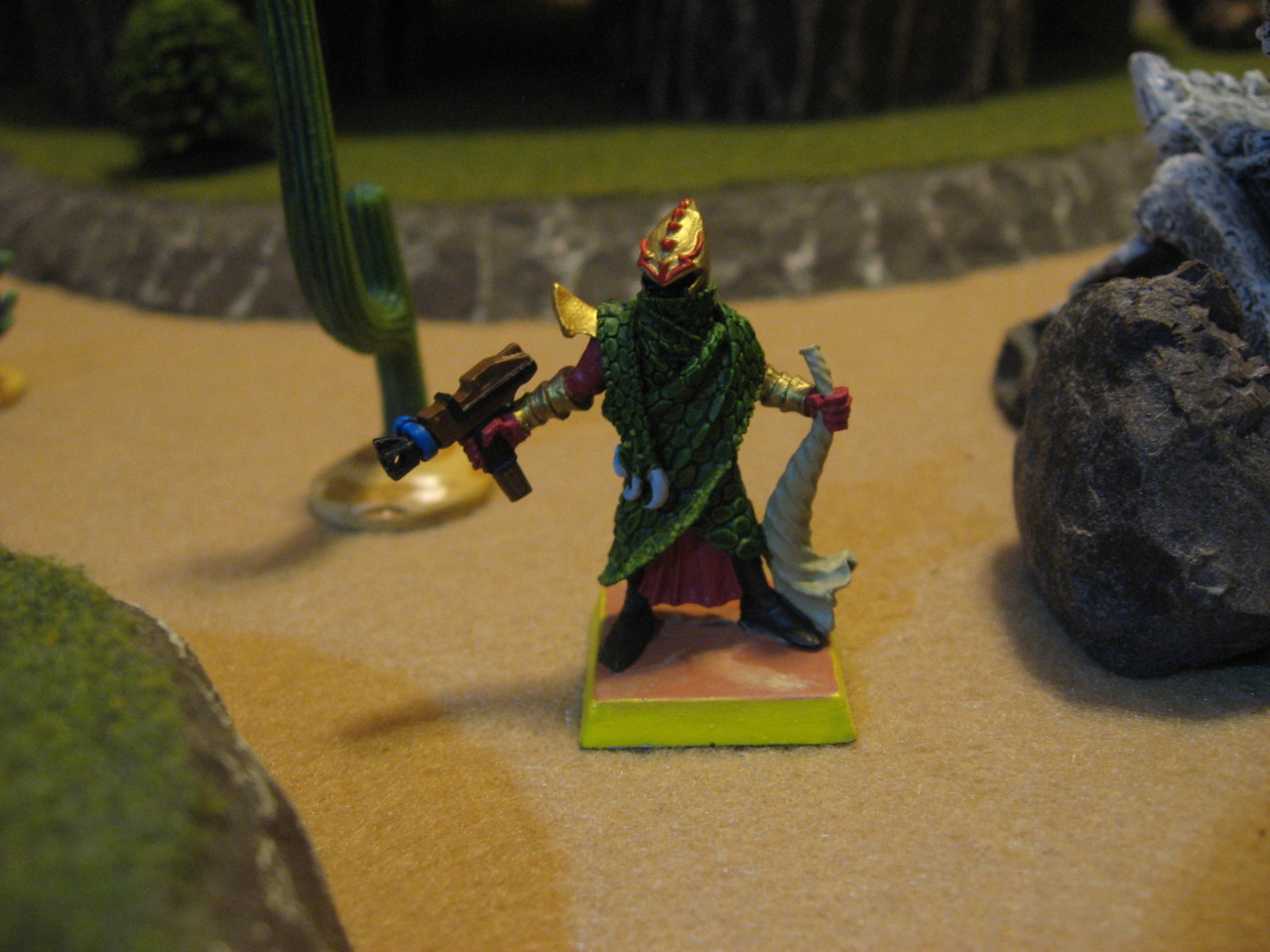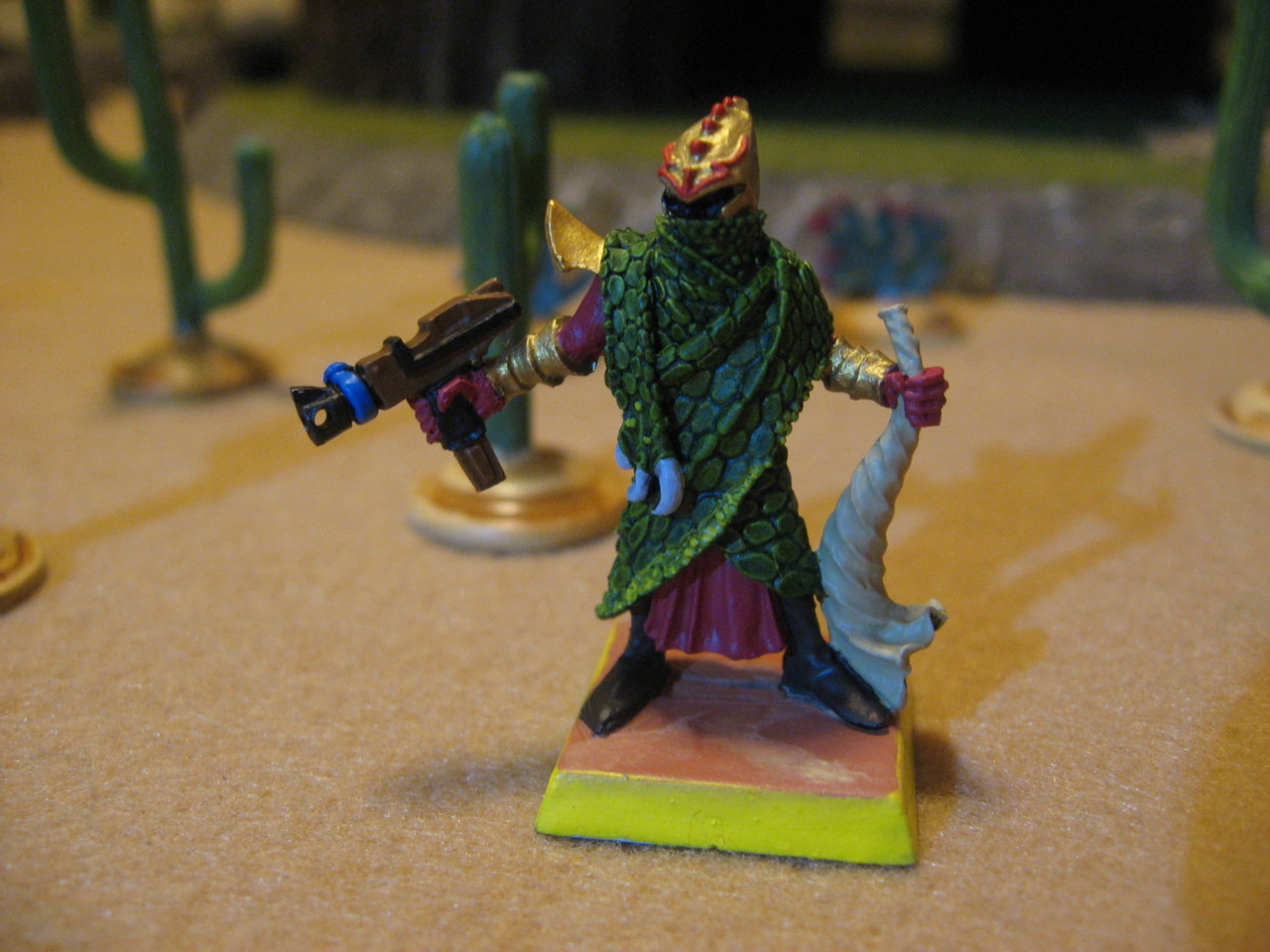 The downside was, being Warhammer Fantasy, this mini had a sword. But I easily converted that by chopping off his hand and using an autopistol from my Necromunda parts. The best part is this particular Dark Elf mini is meant to have a reptile skin as a cloak, which is a perfect dinosaur looking skin.