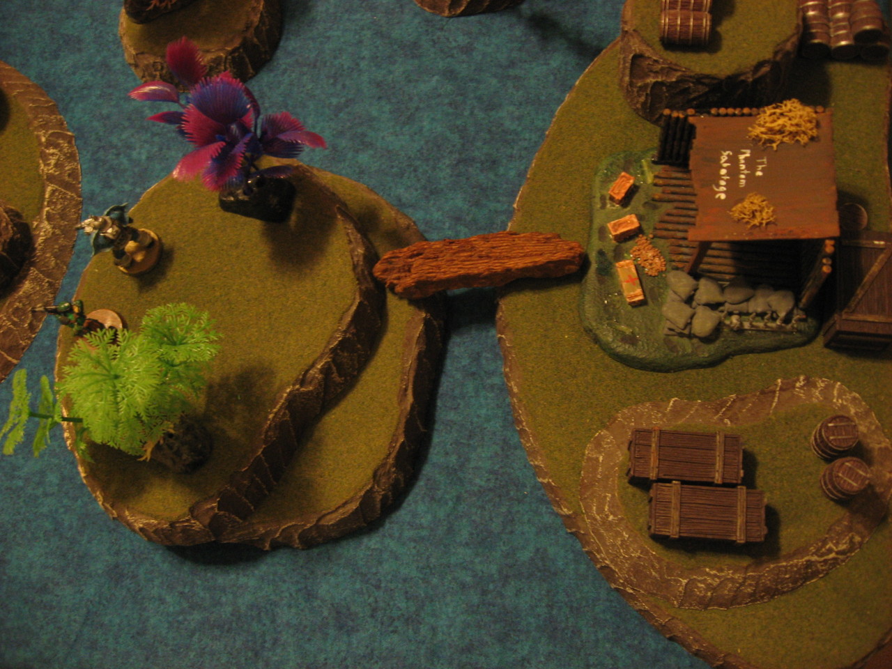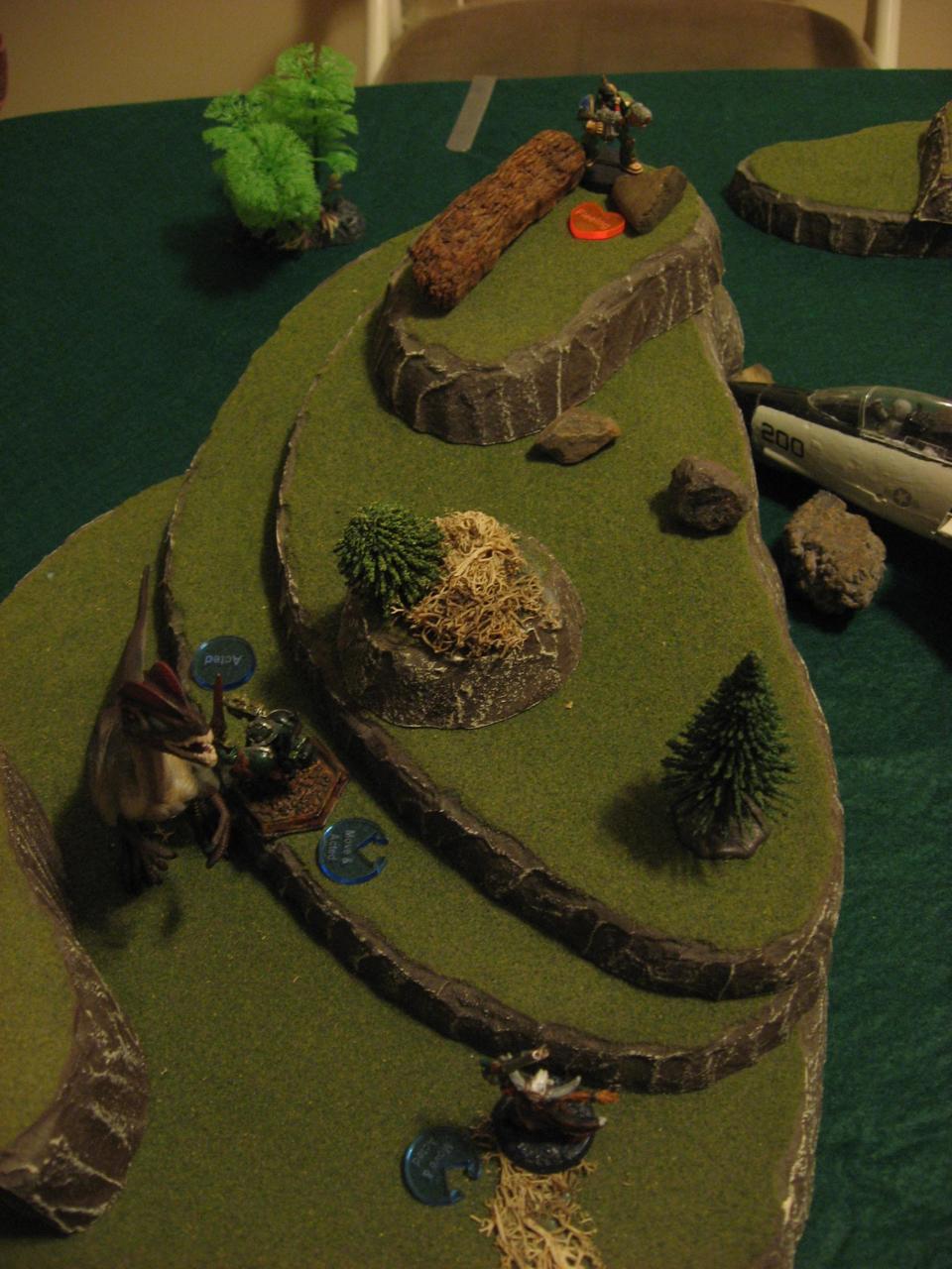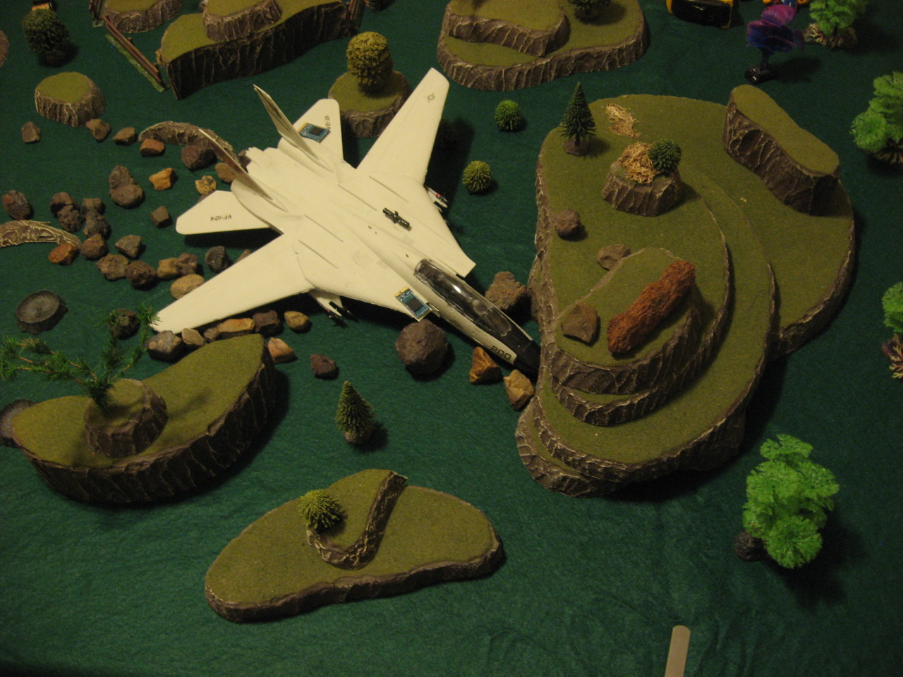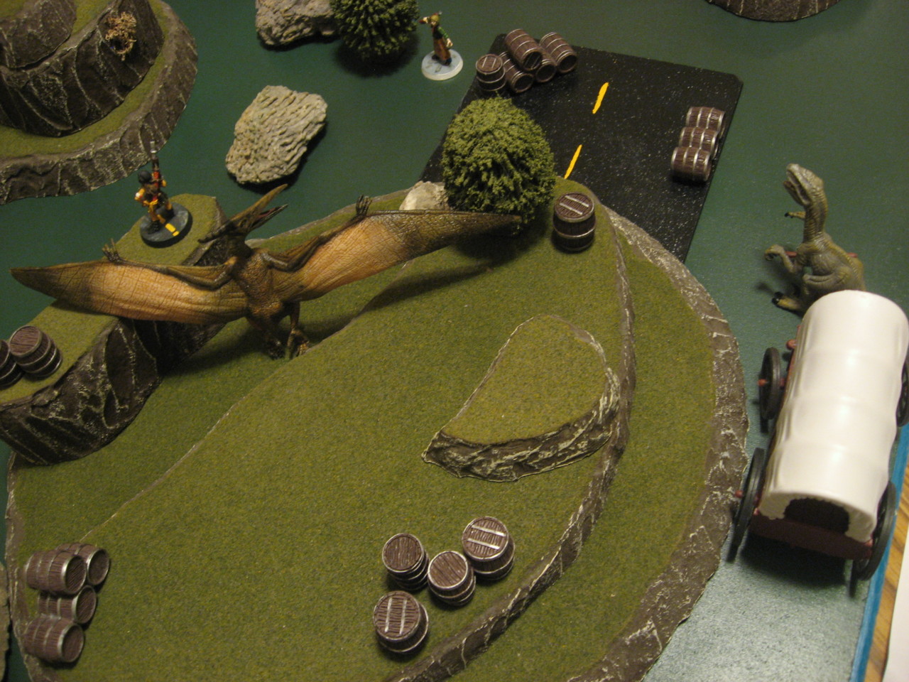The central feature of the table was the crashed and decaying F-14 Tomcat. I used a bunch of trailing rocks to make a slide/crash zone and hopefully give some sense of weight to the plane. The pilot was likely heading for the softer jungle at the edge of the table, but fell short and crashed into a solid stone hill. Otherwise an old corral/pen containing barrels and a sabertooth skeleton, a few hills and the usual trees, and the table was set.